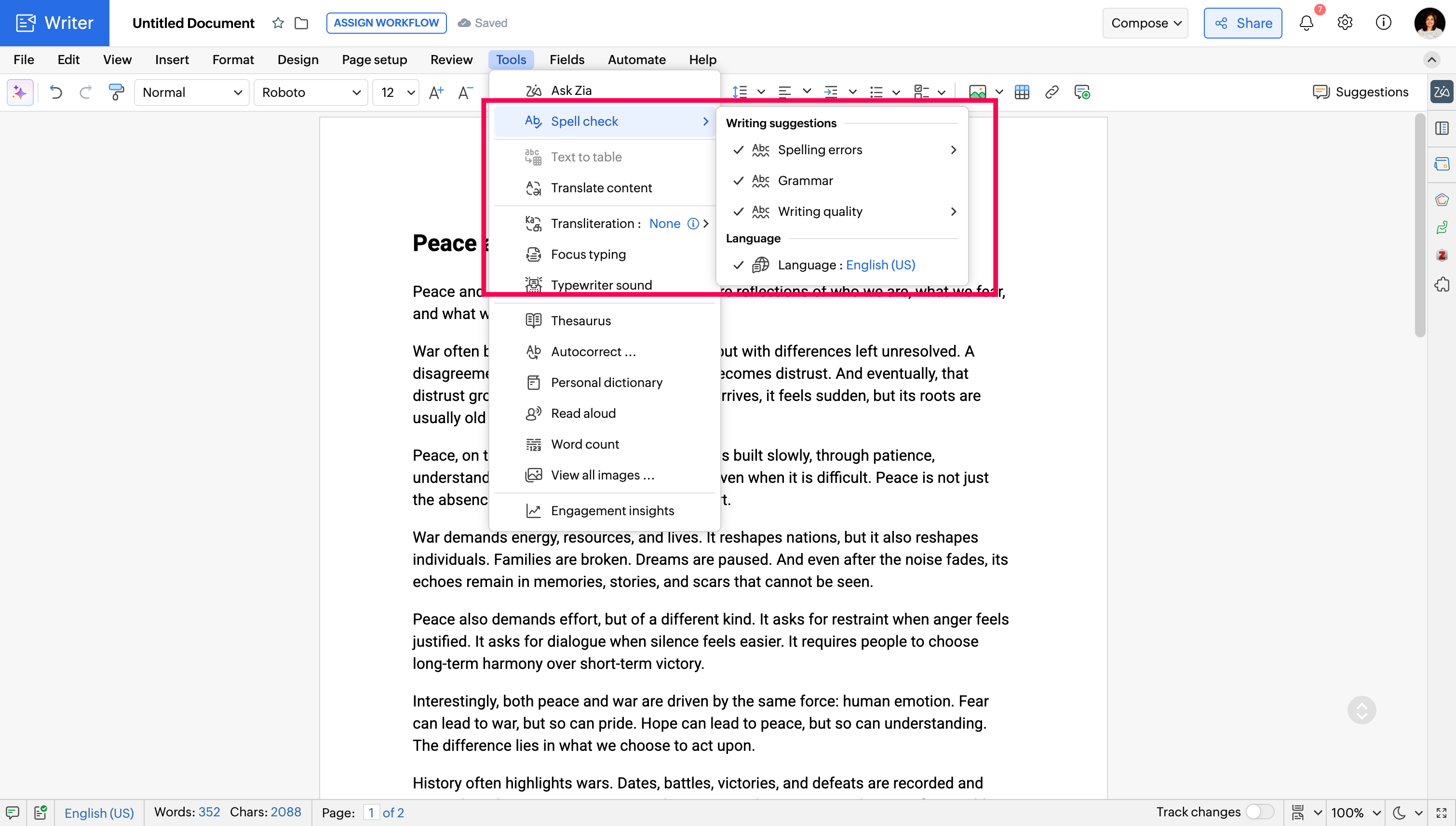 Zoho Zia がトーン、文体、スタイルを評価し、改善案を提示します。多用されている副詞、受動態、決まり文句、トーンの不一致などをリアルタイムで検出します。 |