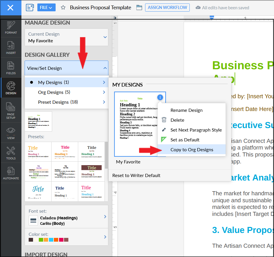 ユーザーは「マイデザイン」、「組織デザイン」、または「プリセットデザイン」から任意のデザインを選び、初期設定としてすべての作成ドキュメントに適用できます。