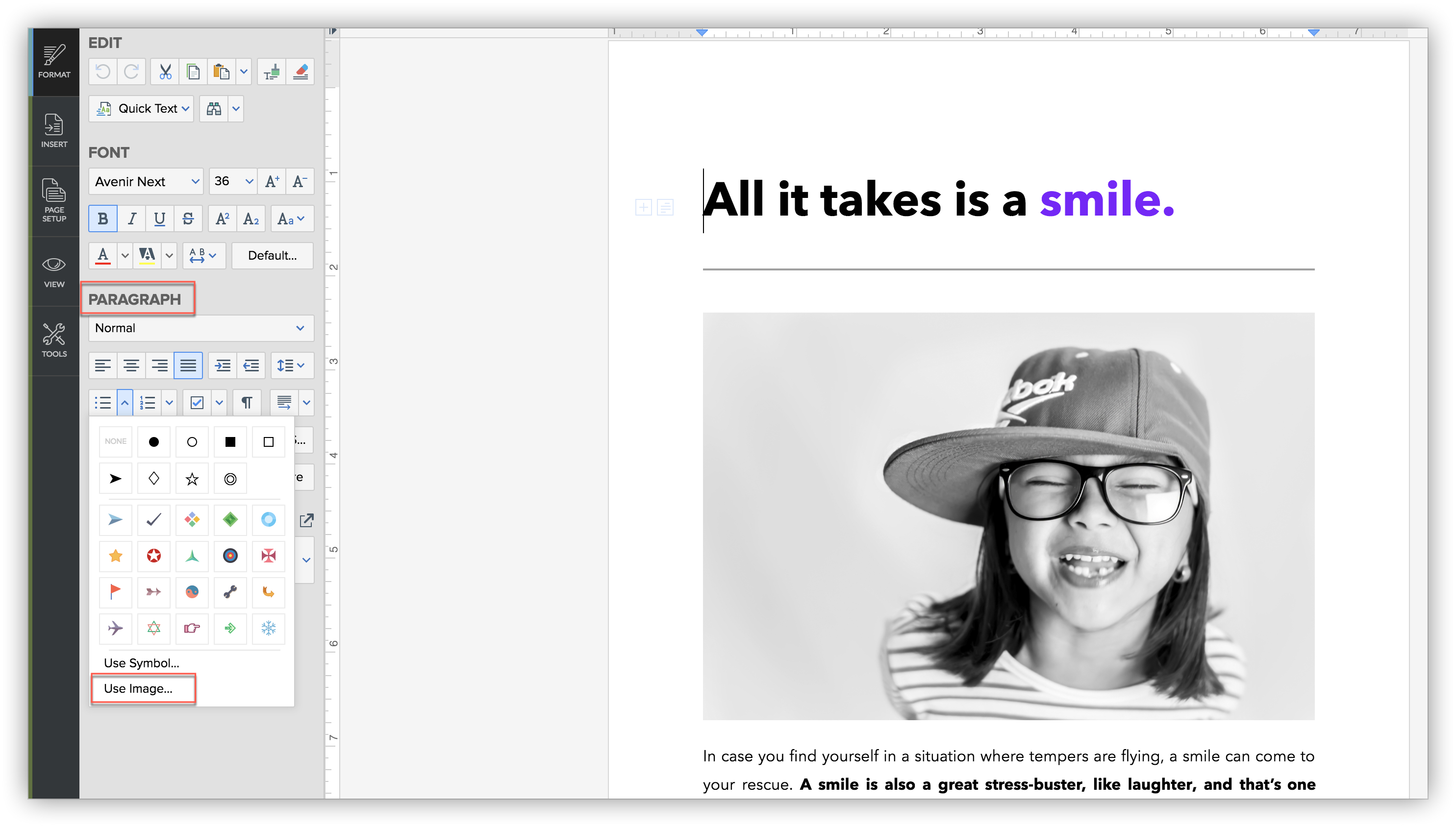 リストを視覚的に魅力的にするために、箇条書きを画像に置き換えることができます。