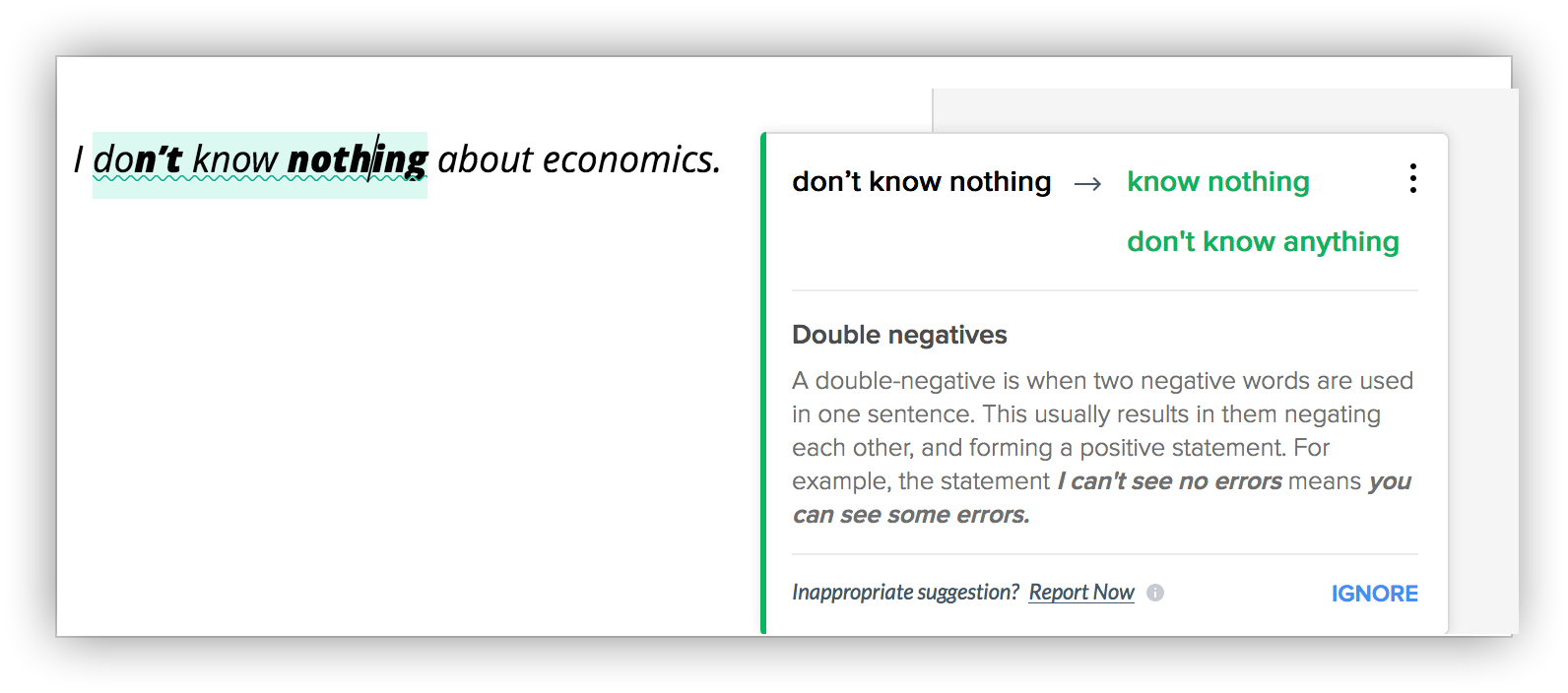 上記の文では、書き手は2つの否定語を使用して、経済学について何も知らないことを表現しています。Ziaは自動的に二重否定をあなたの文章中で識別し、代替案を提案します。