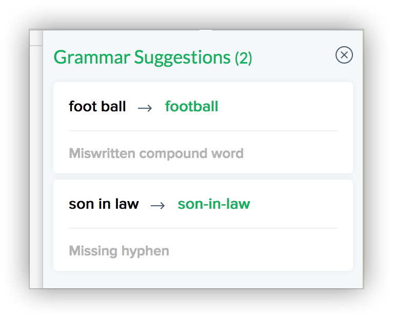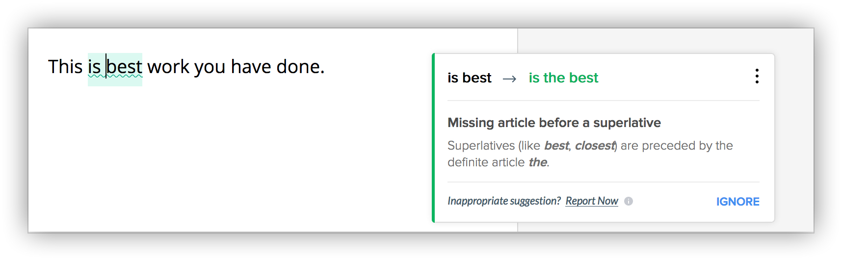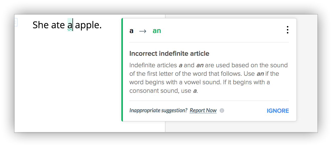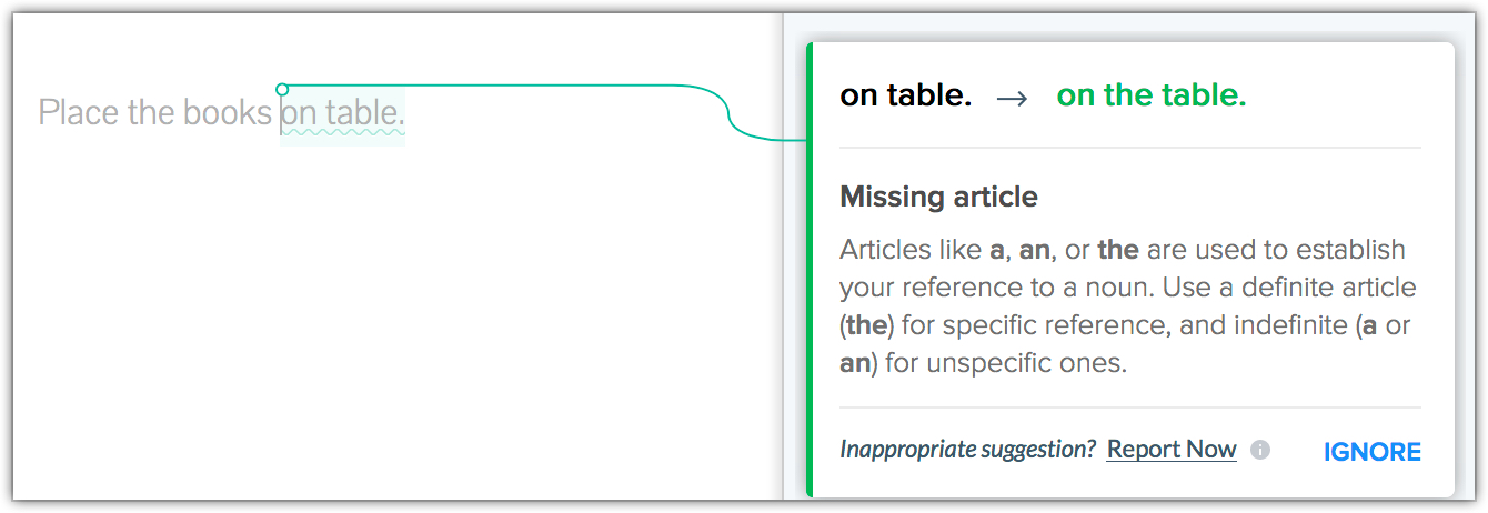 Ziaは一般的な文法の誤りを特定し、訂正のための代替案を提案します。すべての文法の誤りは緑色でハイライトされます。