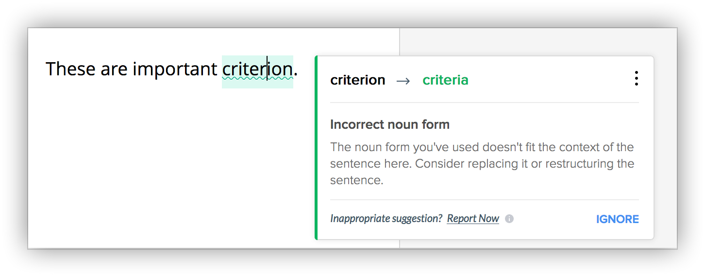 文脈に合わない名詞の形を文中で使用している場合、「不適切な名詞の形」という誤りがハイライトされます。