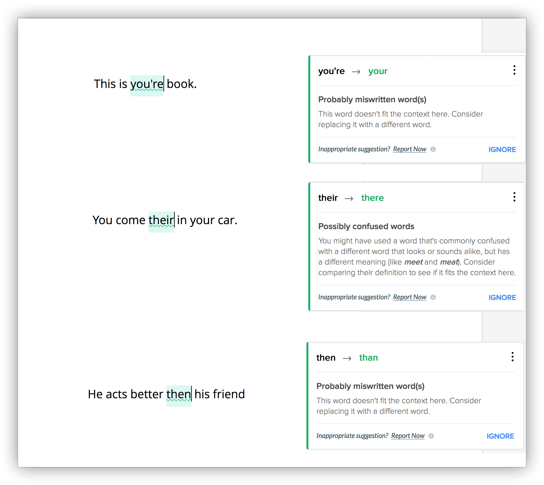 Ziaはcommonly miswrittenあるいは混同されがちな単語、例えばthereとtheir、you’reとyour、thenとthan、meetとmeatなどを特定し、訂正を支援します。