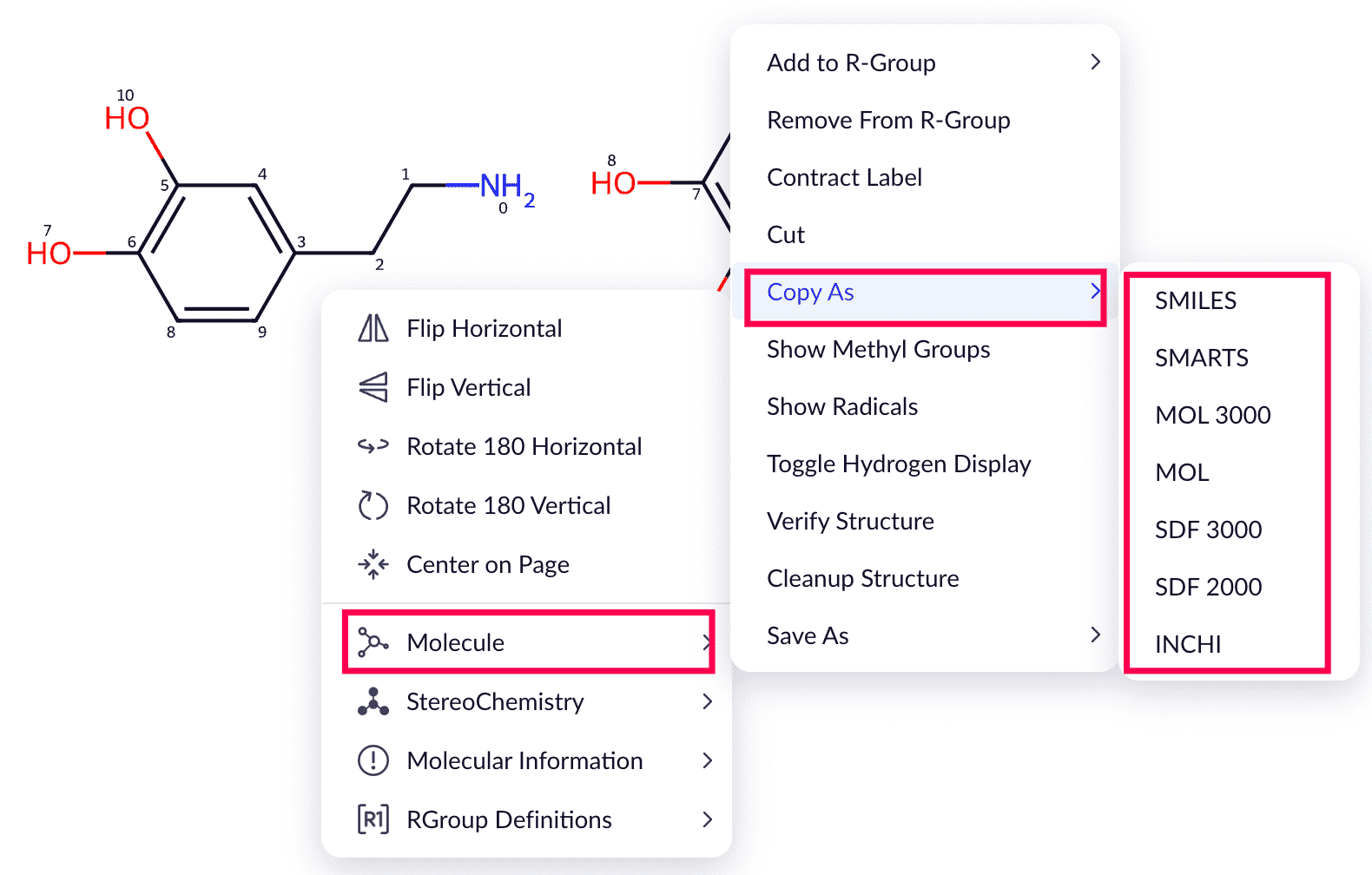 選択された構造をさまざまな形式(Mol、SMILES、InChi、SMARTS)で複製します。