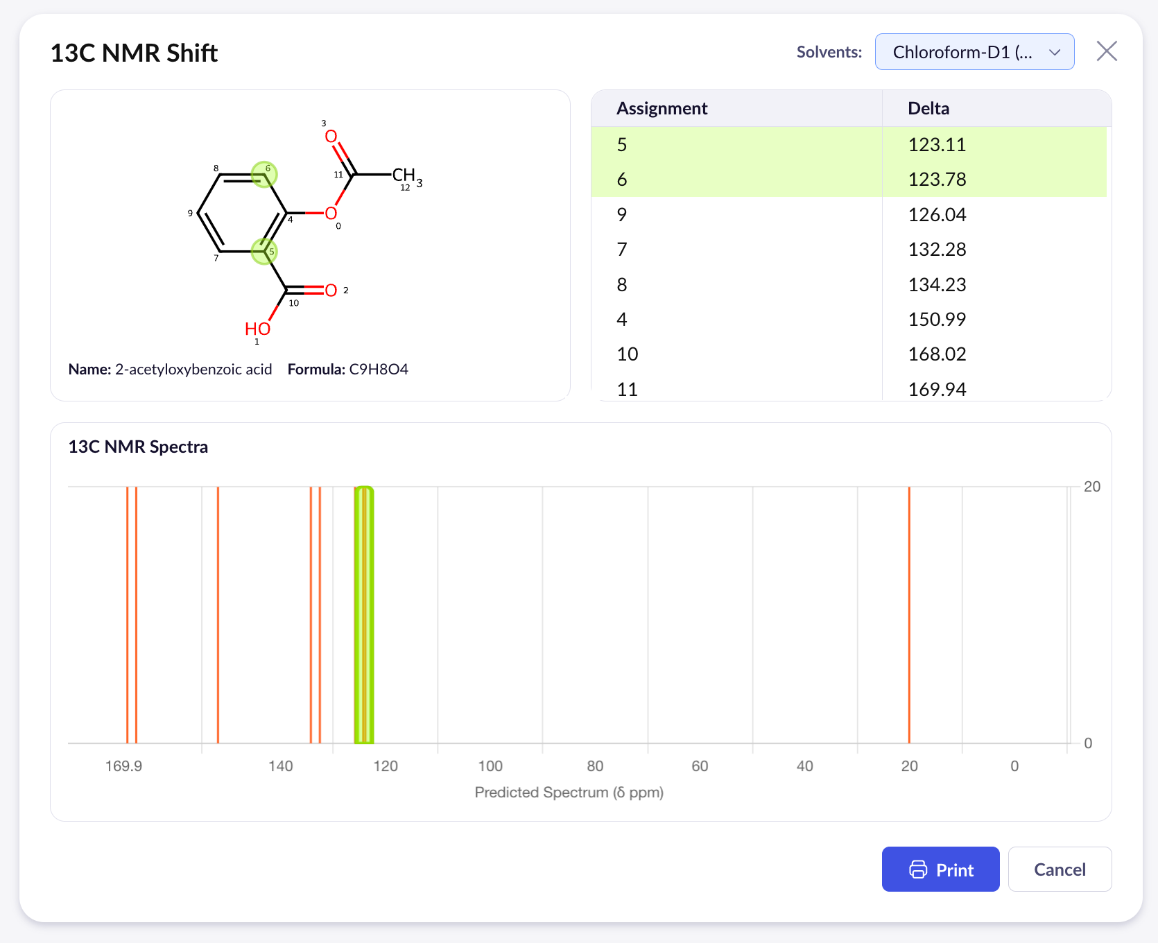 13C NMR 予測ツールは分子構造を受け取り、予測された 13C 化学シフト値を返します。