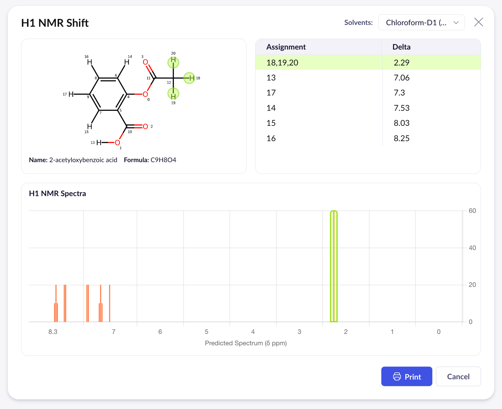この予測ツールは分子構造を受け取り、D2O、CDCL3、またはDMSO溶媒中での予測された1H化学シフト値をppmで返します。