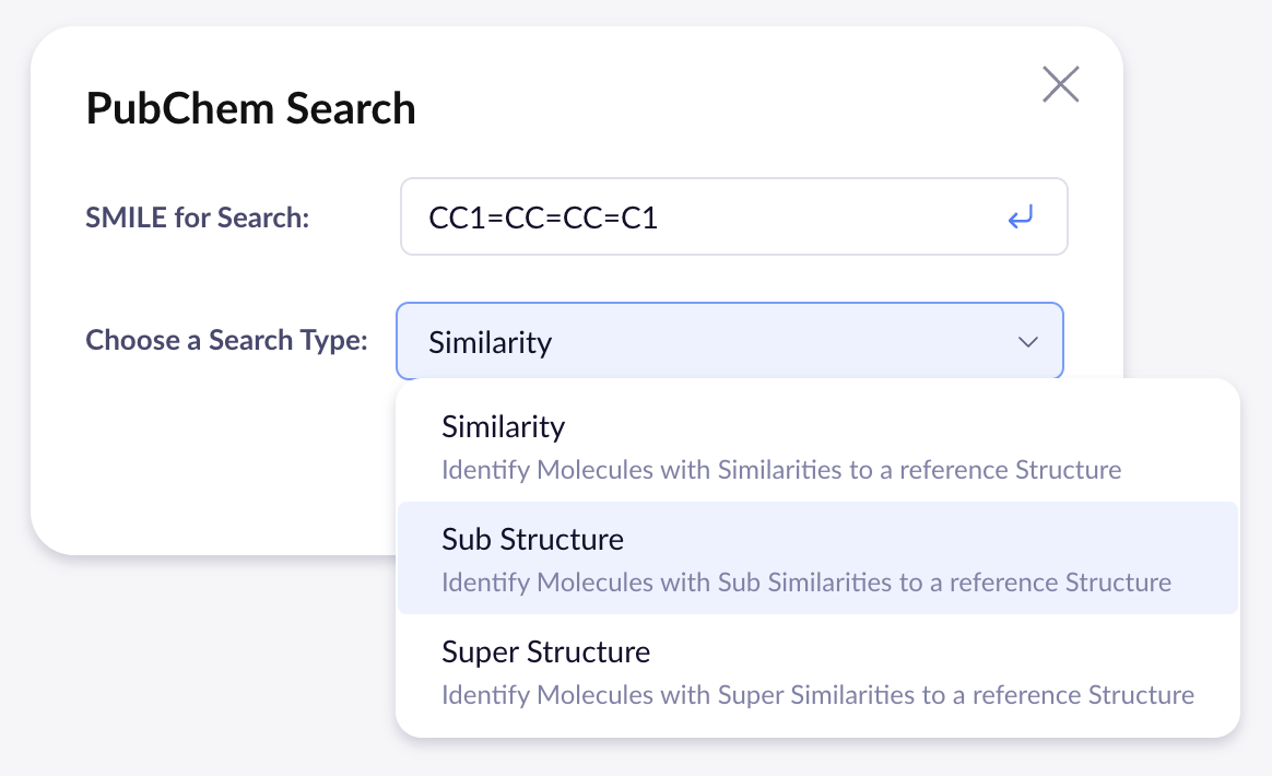 PubChem化合物データベースで、化学構造またはパターンに基づいて、類似構造物、上位構造物、下位構造物を検索します。