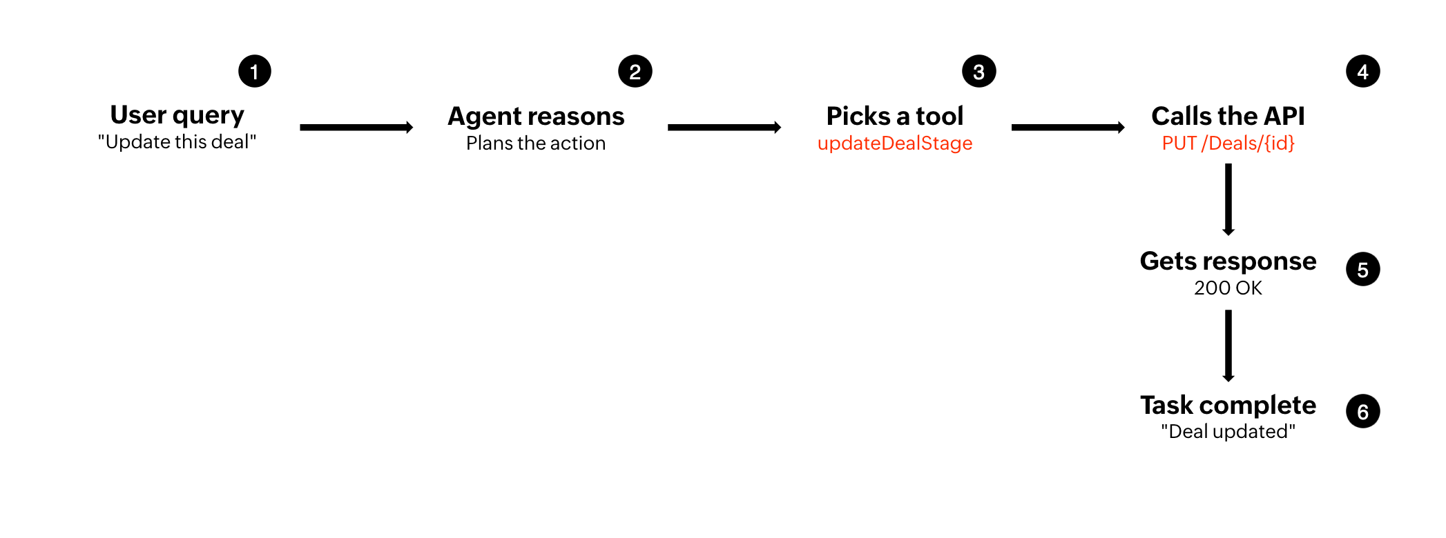 ツールは「アクションレイヤー」です。エージェントがデータを取得したり、商談ステージを更新したり、メールを送信したりするたびに、許可された API を呼び出しています。