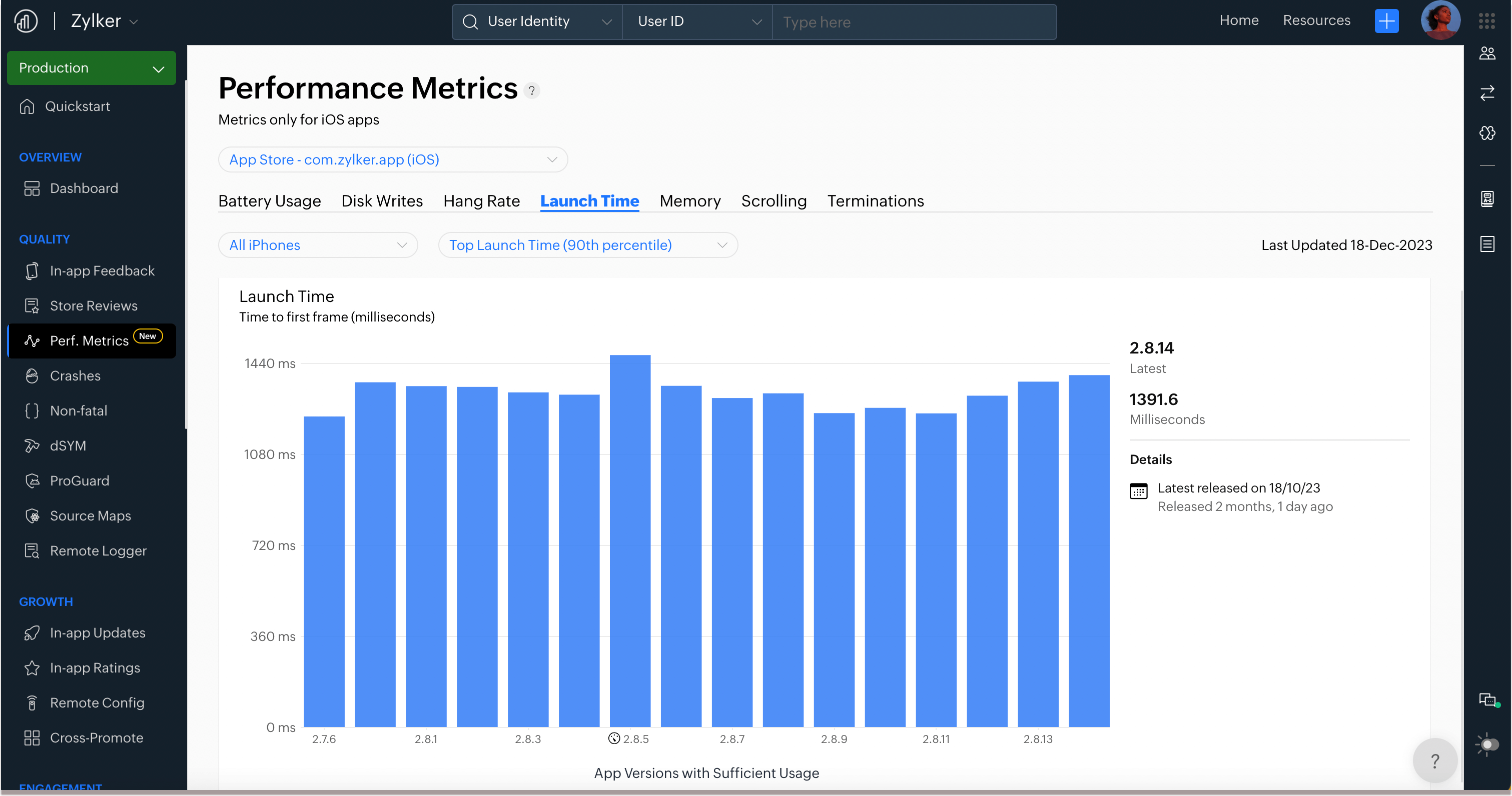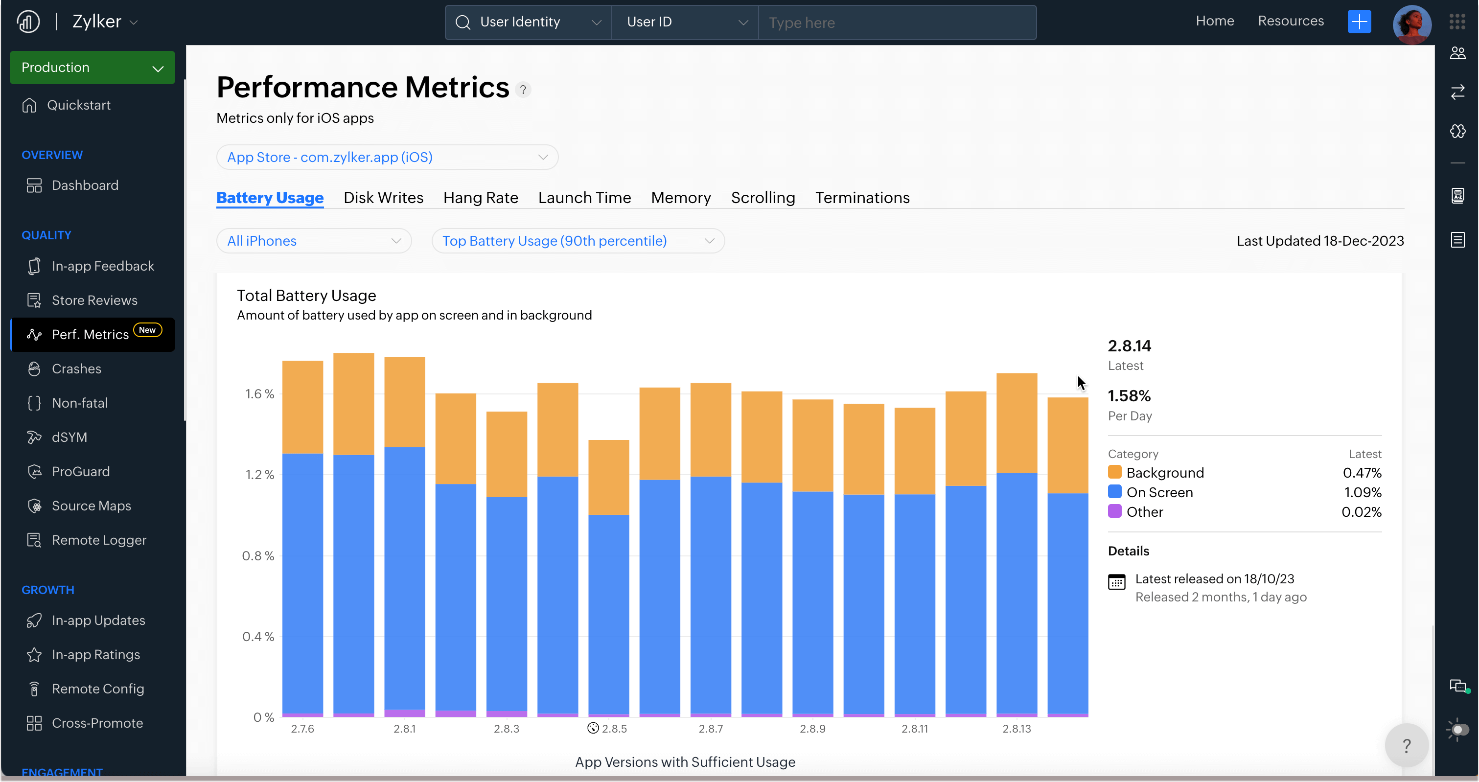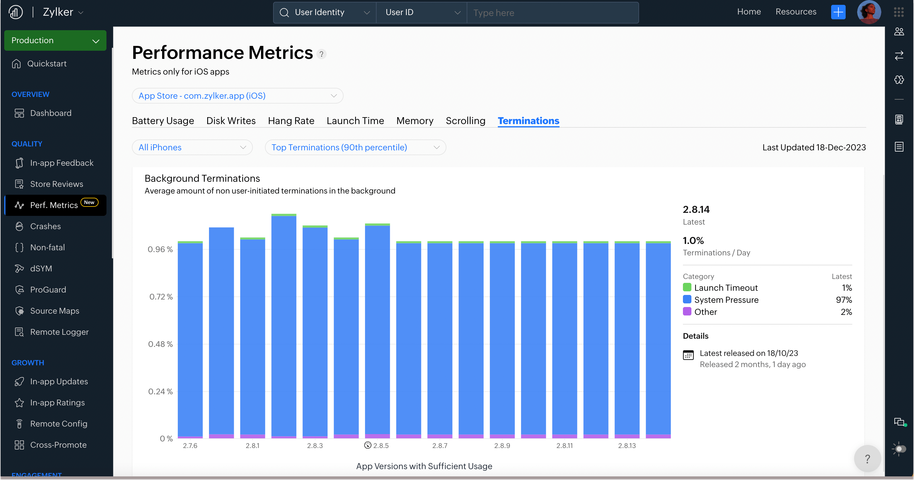 3. 特定のアプリバージョンをクリックすると、iOSアプリの主要なパフォーマンスメトリクスの詳細な統計情報を取得できます。