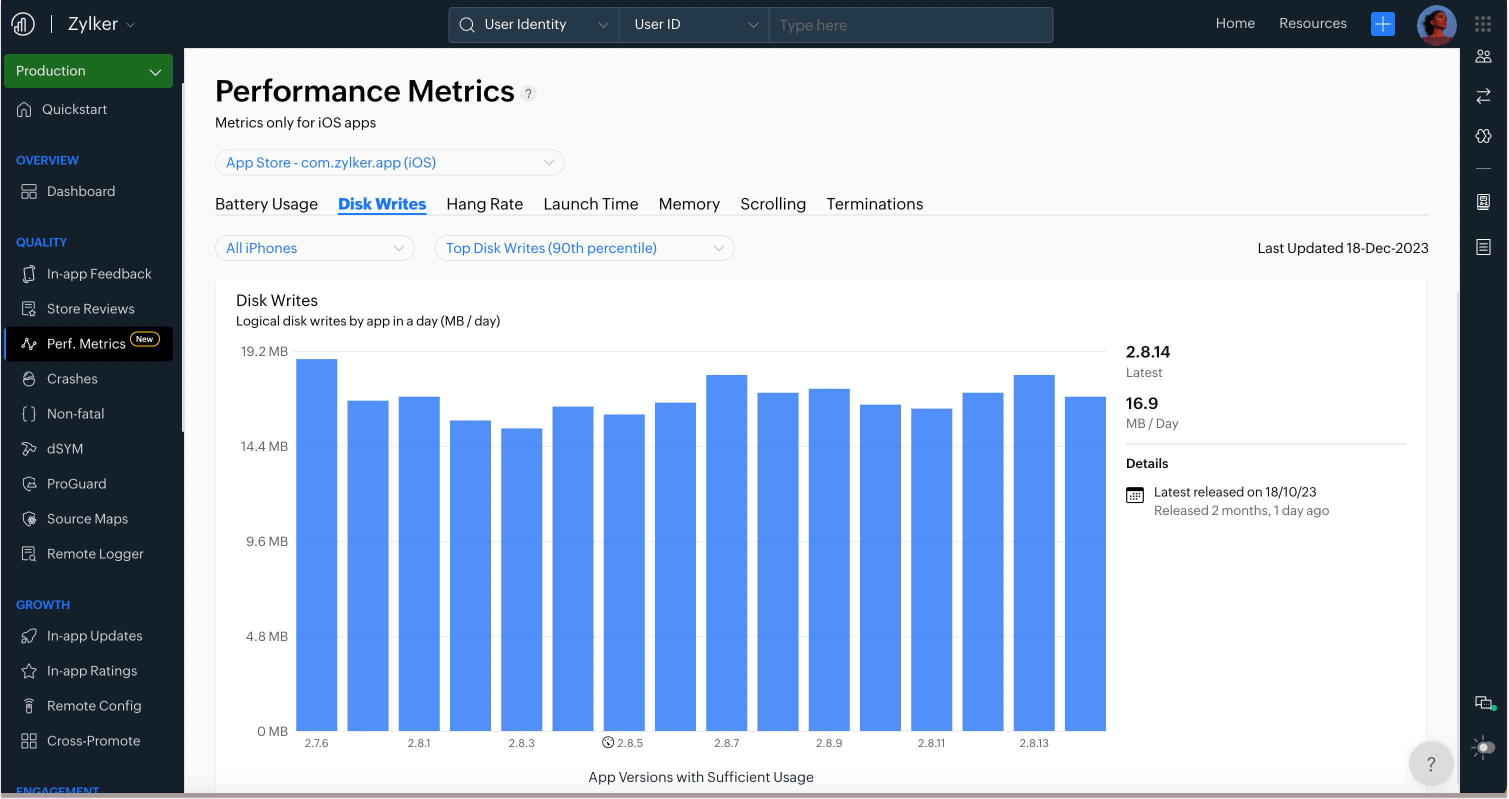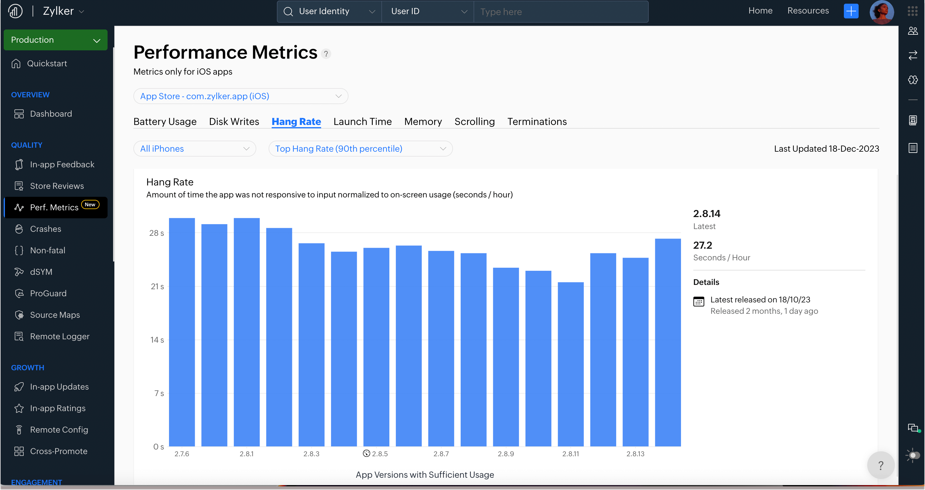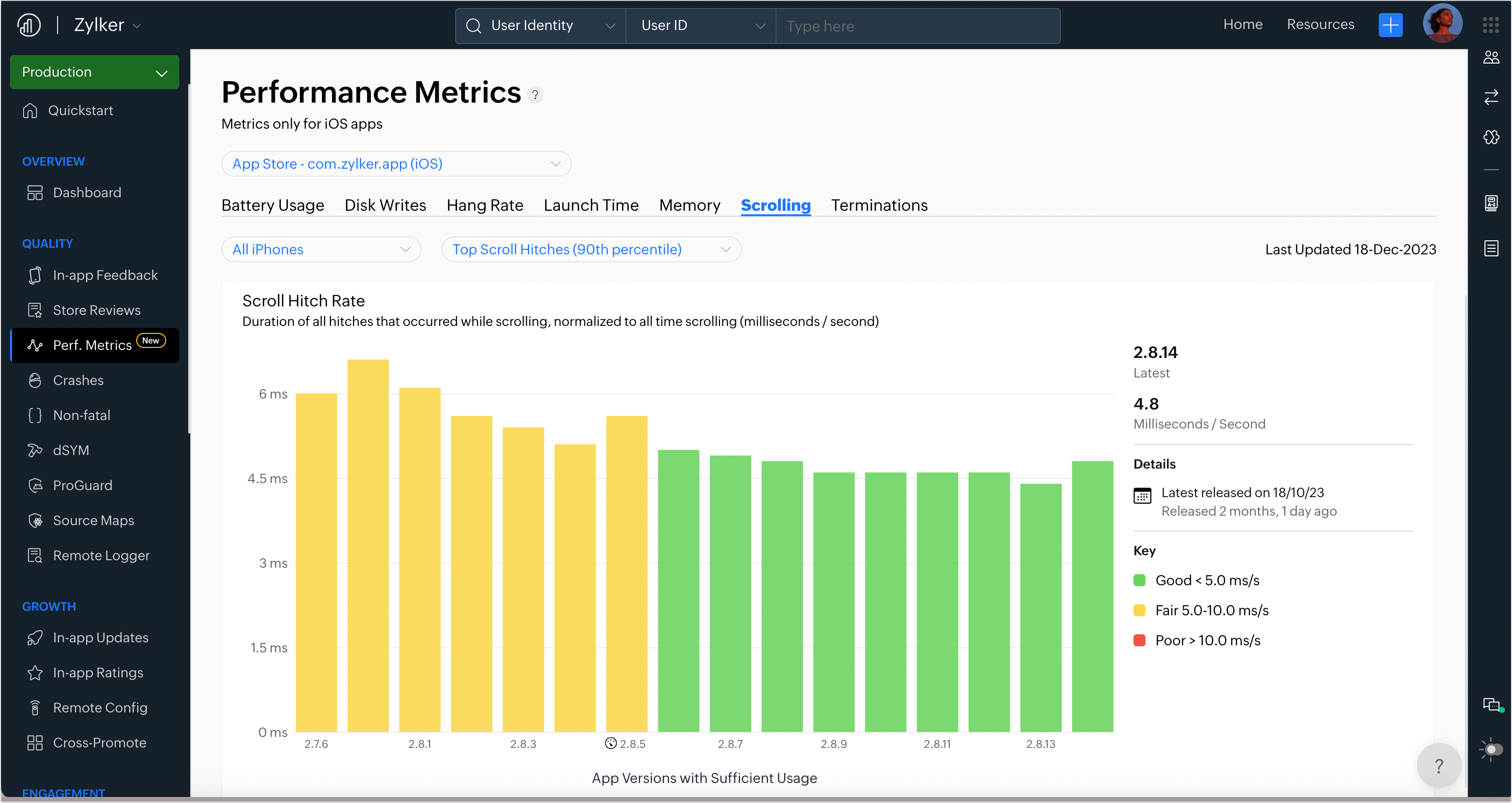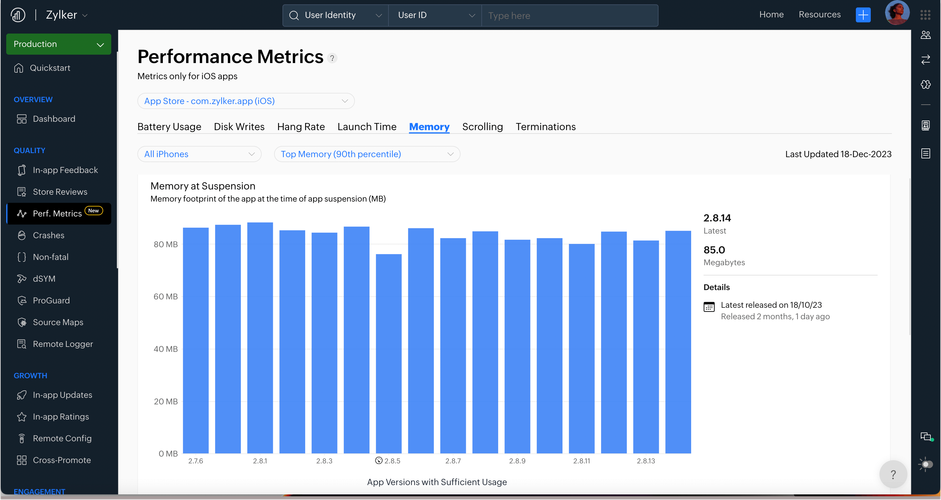 3. 特定のアプリバージョンをクリックすると、iOSアプリの主要なパフォーマンスメトリクスの詳細な統計情報を取得できます。