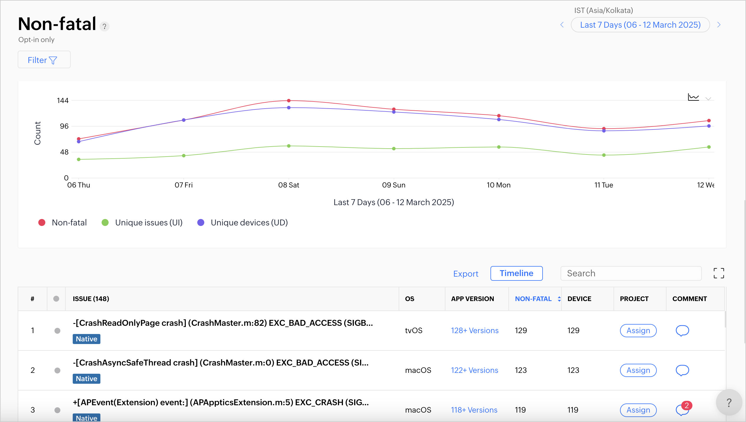 2. チャートでは、致命的でないエラーの件数や、選択した日付範囲内で各プラットフォームごとに発生したエラーのタイムラインを視覚的に把握できます。
