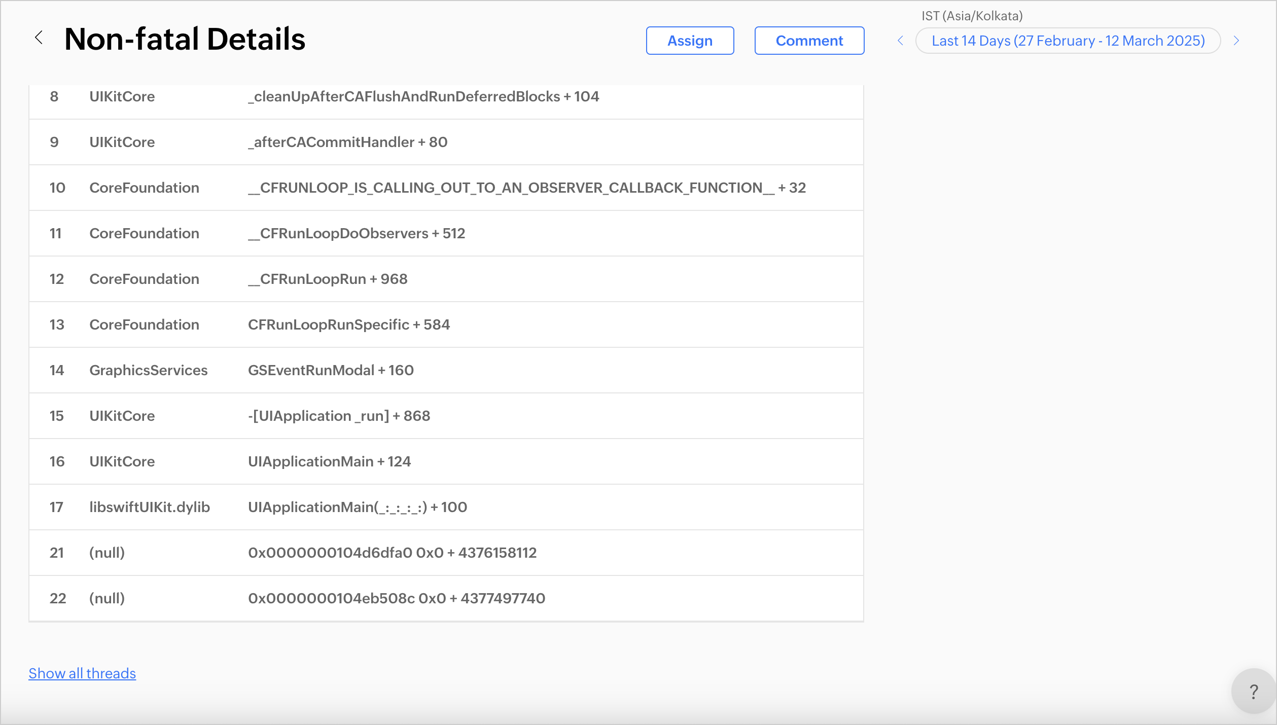 1. 現在のスレッドごとにシンボリケートされたスタックトレースを初期設定で確認でき、デバッグや問題解決に役立ちます。すべてのスレッドを表示 をクリックすると、全スレッドを含むスタックトレース全体が表示されます。