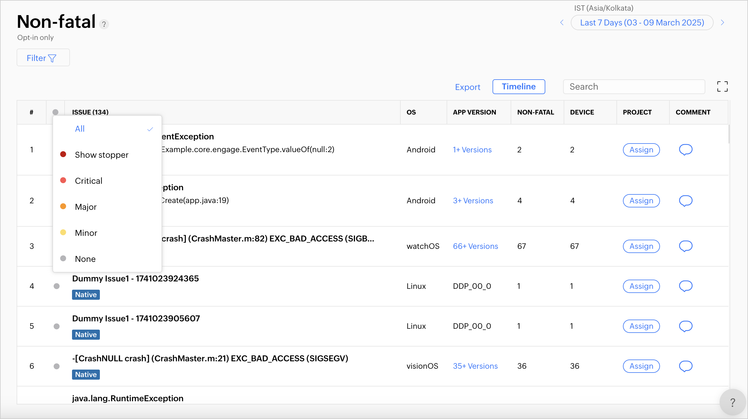 2. さらに分かりやすくするため、各ユニークな問題の横に、非致命的エラーが報告されたアプリフレームワークを示すタグが表示されます。例: NativeReact Native、または Flutter
