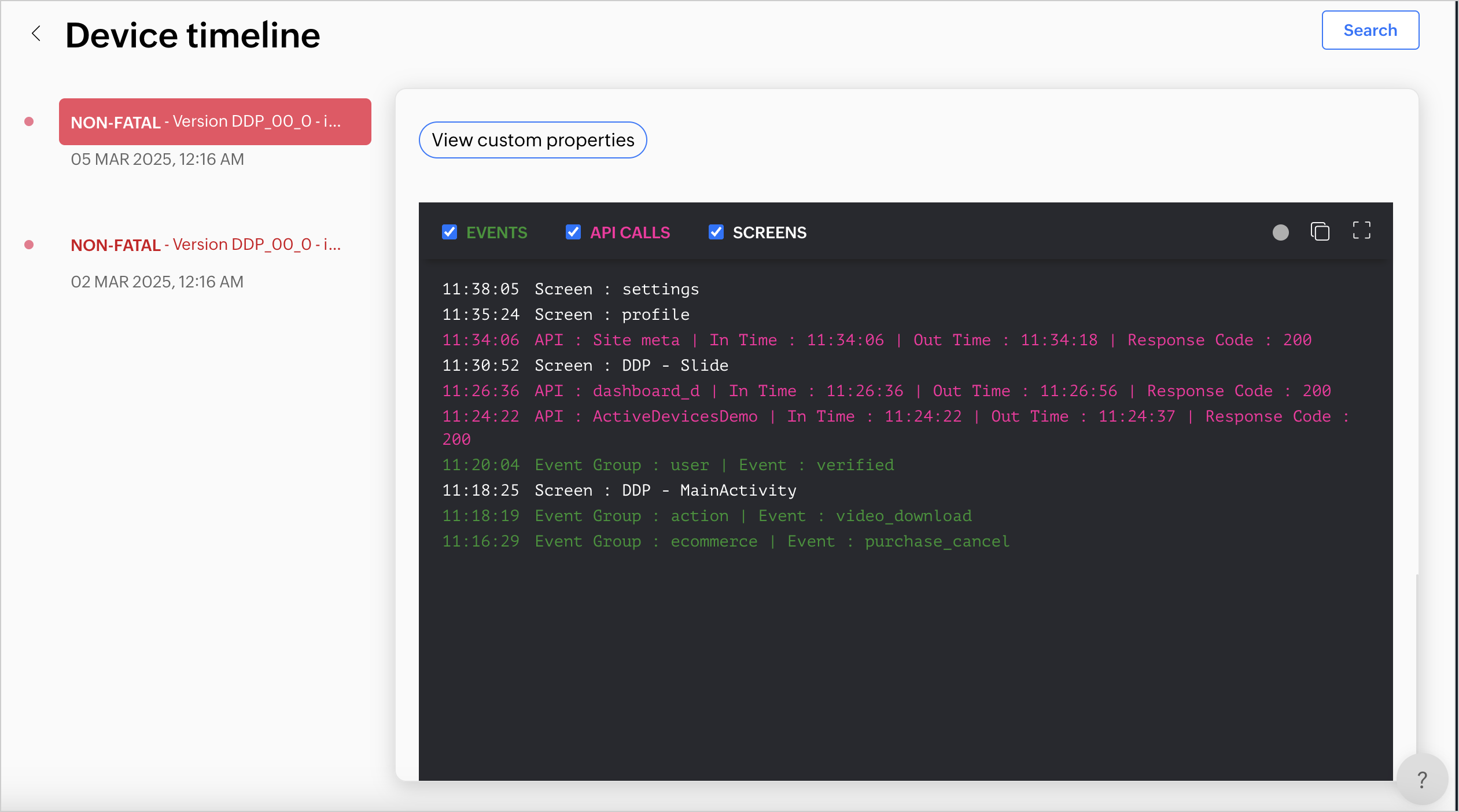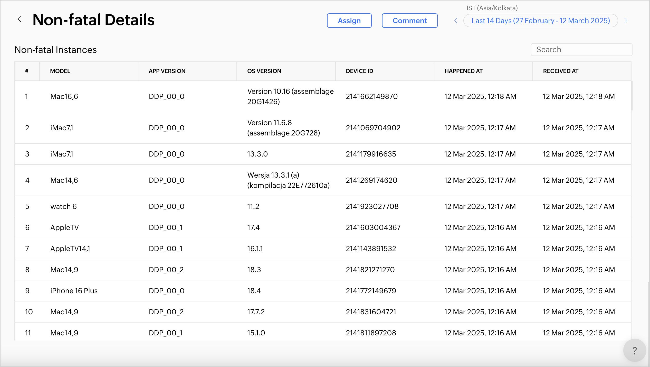 1. リストには、影響を受けたデバイスモデル、アプリバージョン、OSバージョン、デバイスID、非致命的エラーが発生した時刻、およびAppticsで受領された時刻などの詳細が含まれます。個別インスタンスをクリックすると、その他の詳細が確認できます。