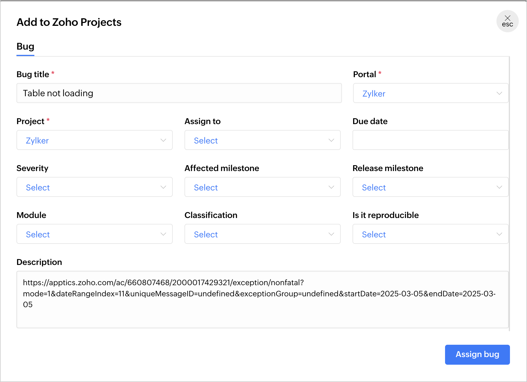 1. ポップアップにすべての詳細を入力し、「Assign bug」をクリックします。課題はプロジェクト内の担当者に割り当てられます。
