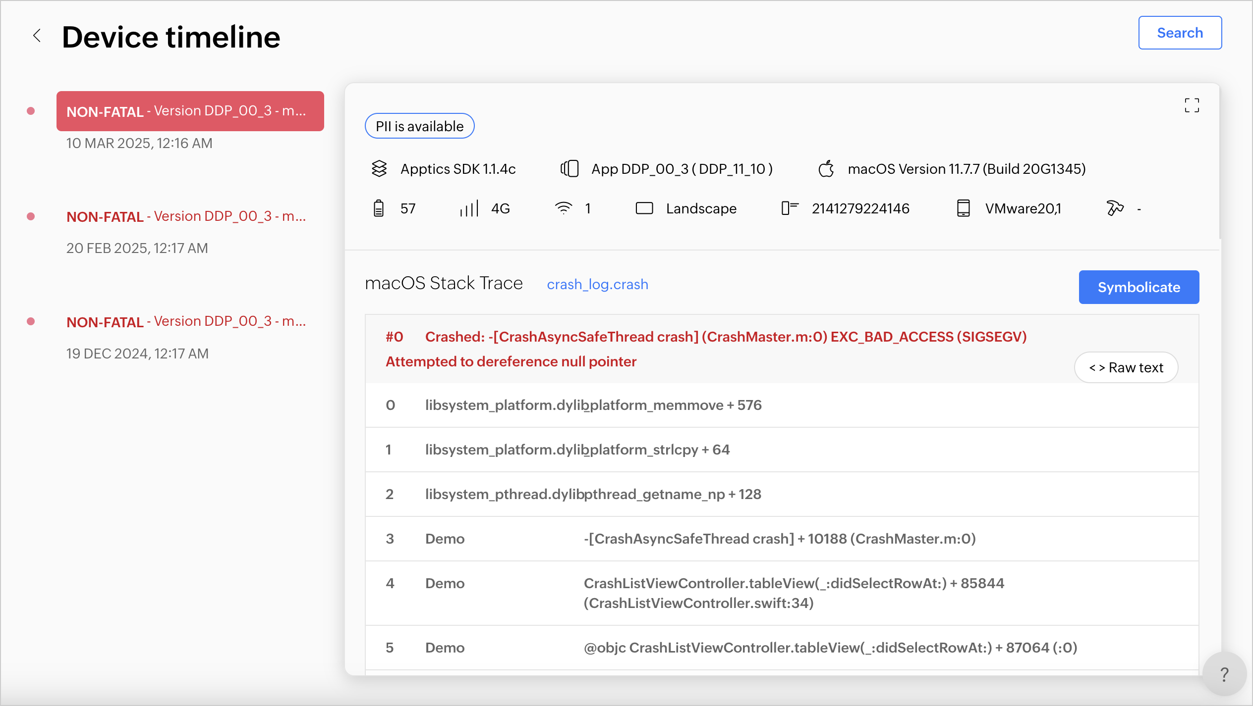 Apptics のエラー追跡には、シンボリケートされたクラッシュレポートやエラーログ、スタックトレース、スレッド、デバイスの詳細、クラッシュ発生環境、ブレッドクラム、その他の診断情報が含まれており、問題のデバッグや根本原因の特定に役立ちます。