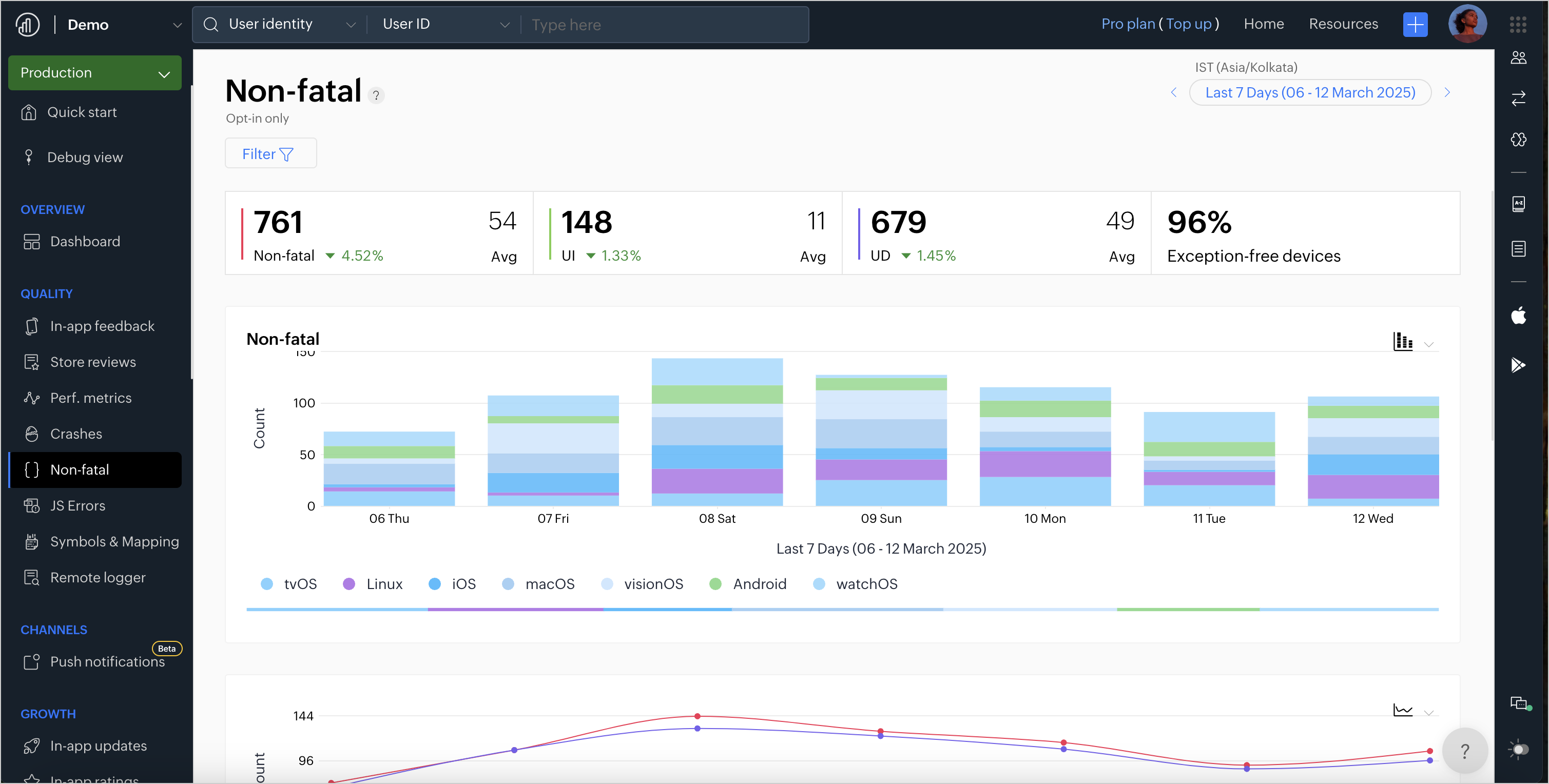 1. 左側のメニューから品質 > Non-fatalに移動します。選択した日付範囲内で、致命的でないエラーの合計数、報告された致命的でないエラーを引き起こしたユニークな課題数、影響を受けたユニークなデバイス数、および例外が発生していないデバイス(例外無料単価)の割合(%)を確認できます。