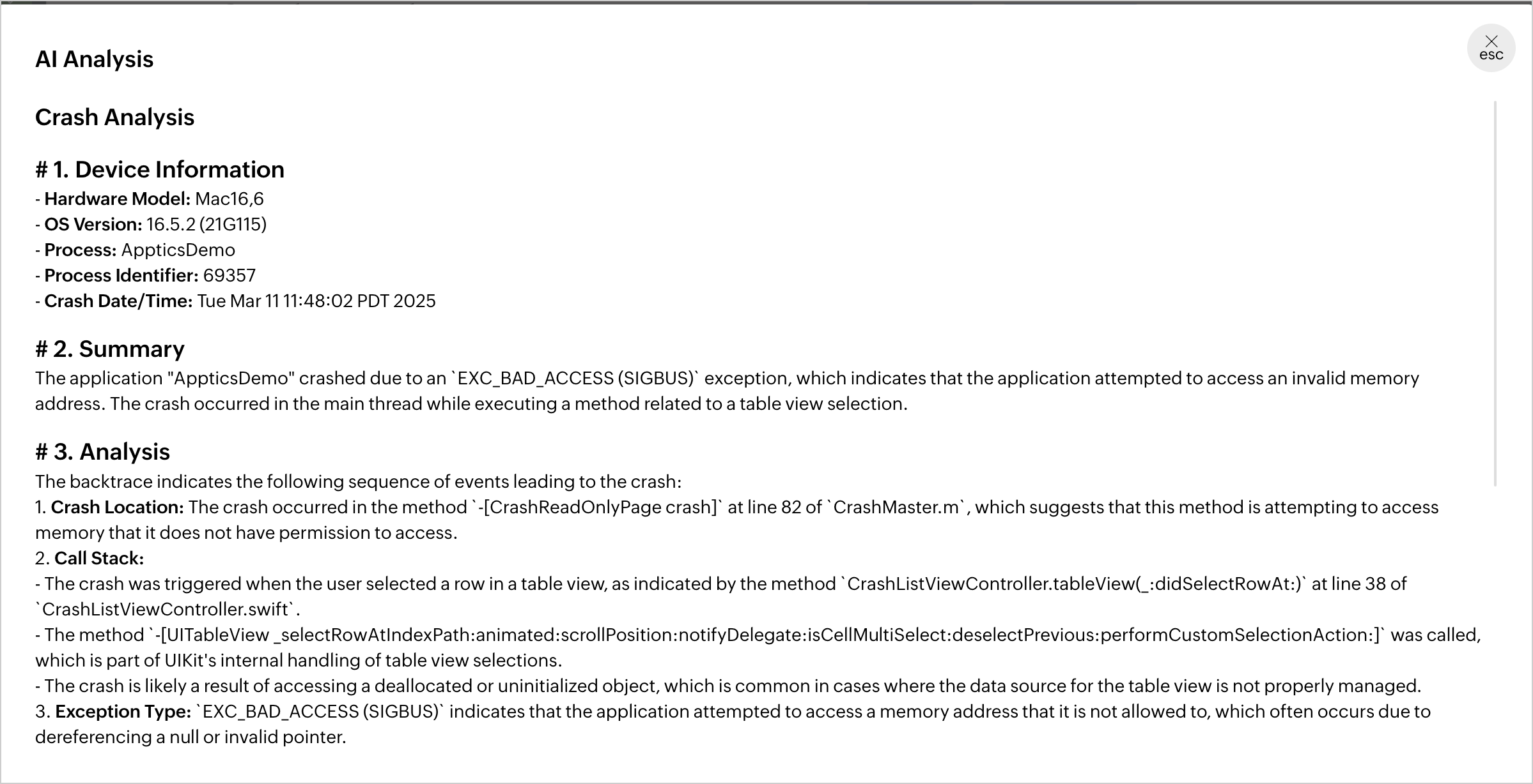 AI解析をクリックすると、デバイス情報、クラッシュ概要、分析、結論、および利用可能な場合は対応策を含むAIによって作成されたエラー分析レポートを取得できます。
