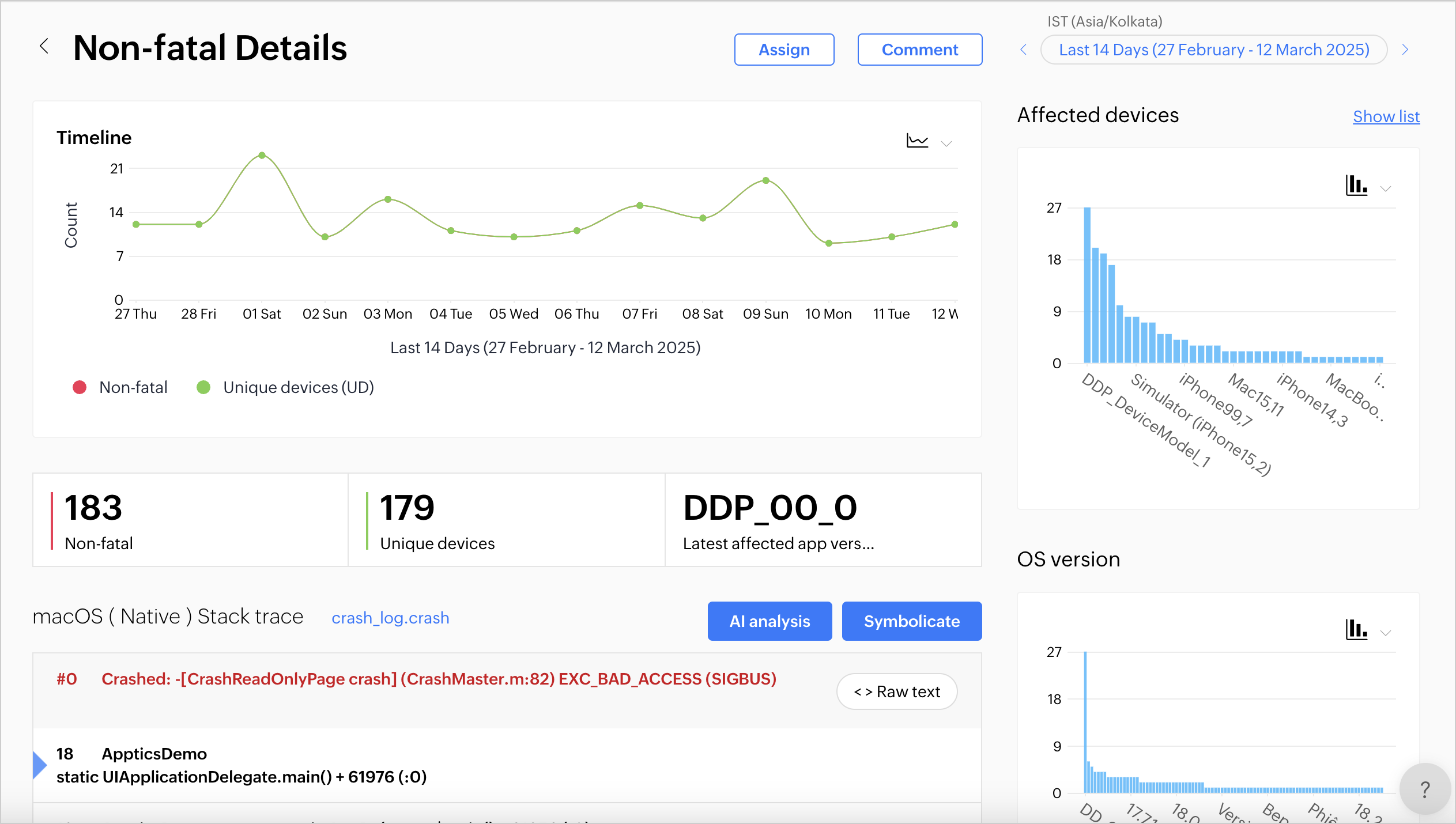 2. 他のグラフでは、影響を受けたデバイス、OS バージョン、アプリバージョンの内訳が確認できます。