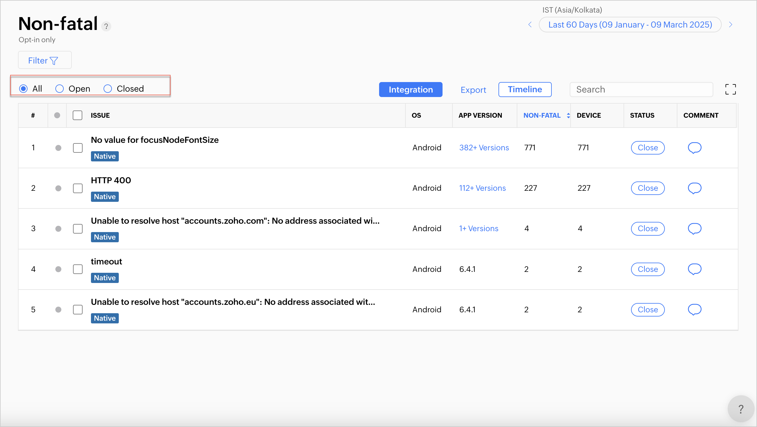 Appticsは、アプリ内のtry-catchブロックで捕捉された致命的でないエラーや例外をデータ化する方法を提供します。Zoho Appticsのnon-fatalタブを使用すると、クラッシュやANRなどの致命的なエラーと同様に、致命的でないエラーを追跡・分析できます。クラッシュやANRにも対応しています。
