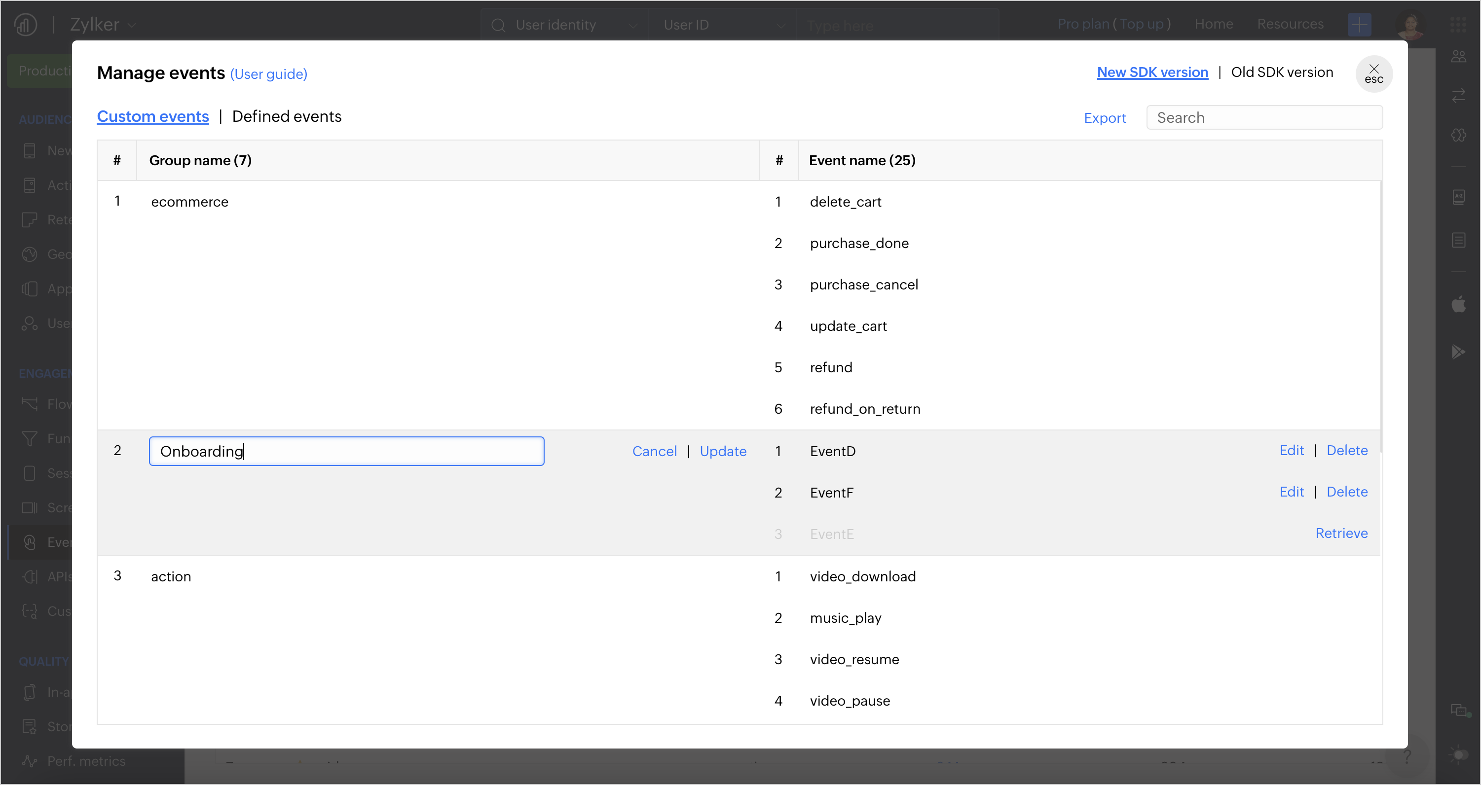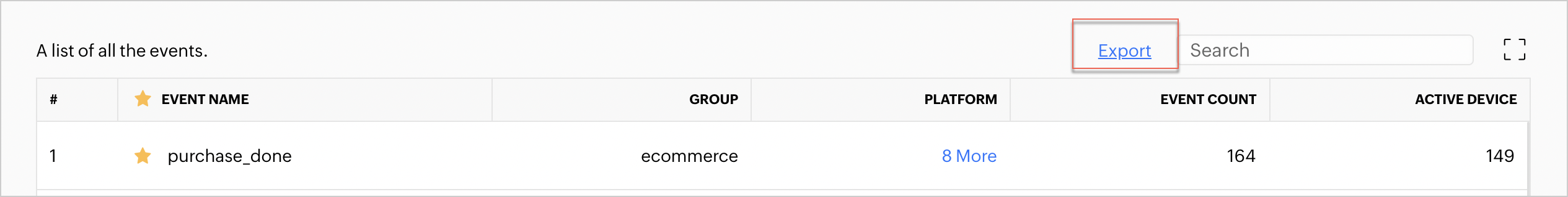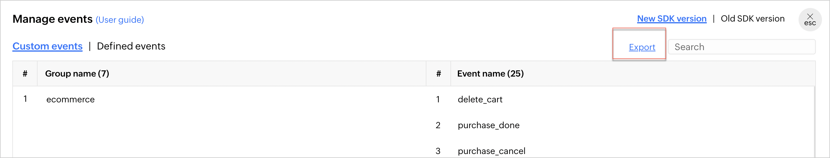 1. アプリでトラッキングされているカスタムタイミングの一覧を.jsonファイルで取得するには、管理処理ポップアップ内のエクスポートオプションをクリックします。