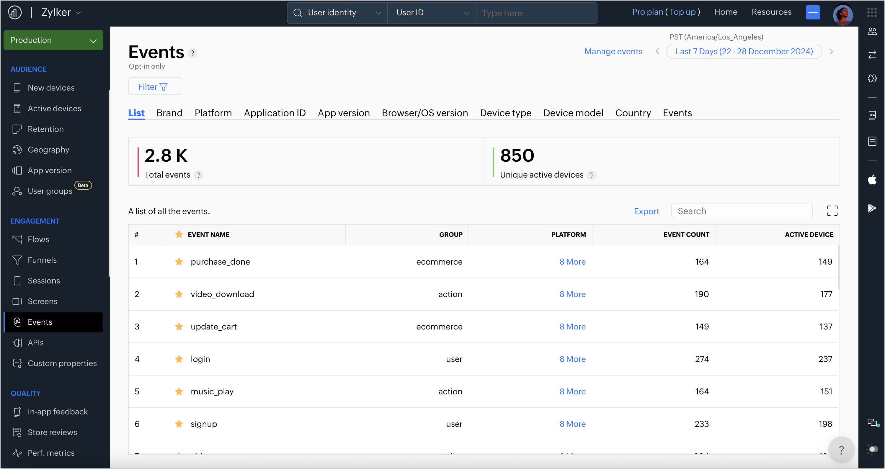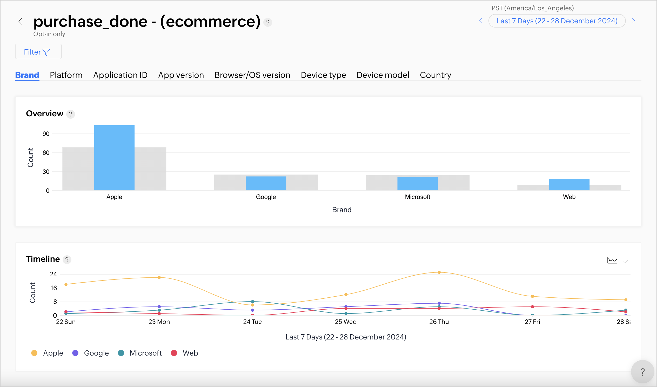 1. 個別イベントをクリックすると、ブランド、プラットフォーム、アプリケーションID、アプリバージョン、ブラウザ・OSバージョン、デバイス種別、デバイスモデル、国ごとにユーザー活動を分析できます。
