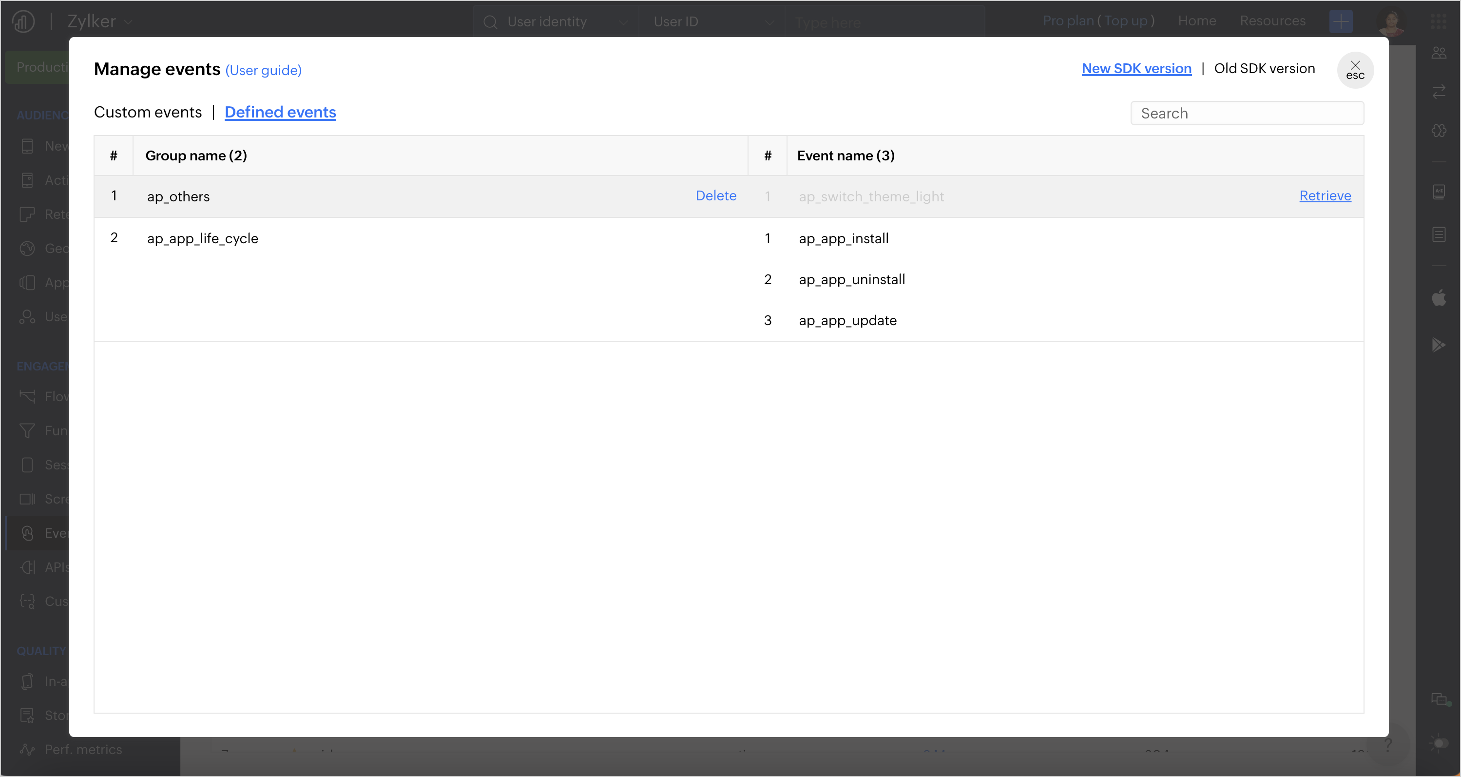 処理のトラッキングを開始するには、まず計測したいユーザー処理を定義し、Apptics SDKの設定時に追加してください。必須のSDK設定が完了すると、コンソール上でアプリに対してトラッキングされている処理の一覧が表示されます。
