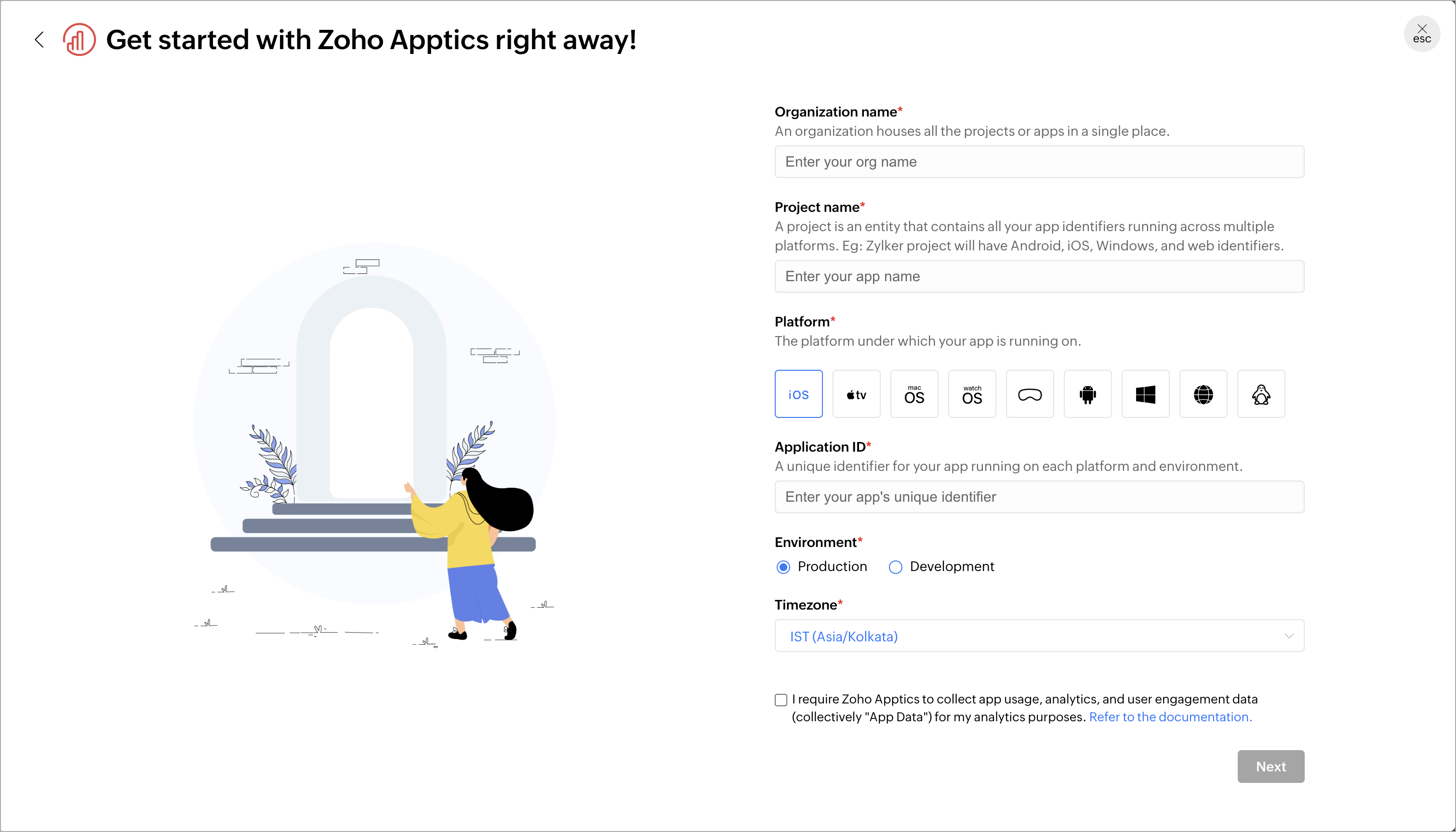 - ウェブブラウザで www.Zoho.com/apptics/にアクセスします。