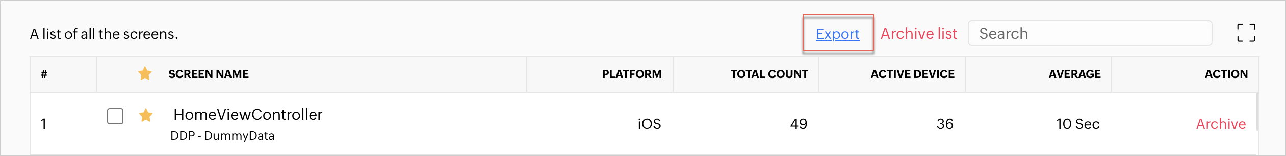エクスポートオプションを画面リスト上部でクリックすると、トラッキングされたすべての画面とその統計情報を.csvファイルでエクスポートできます。