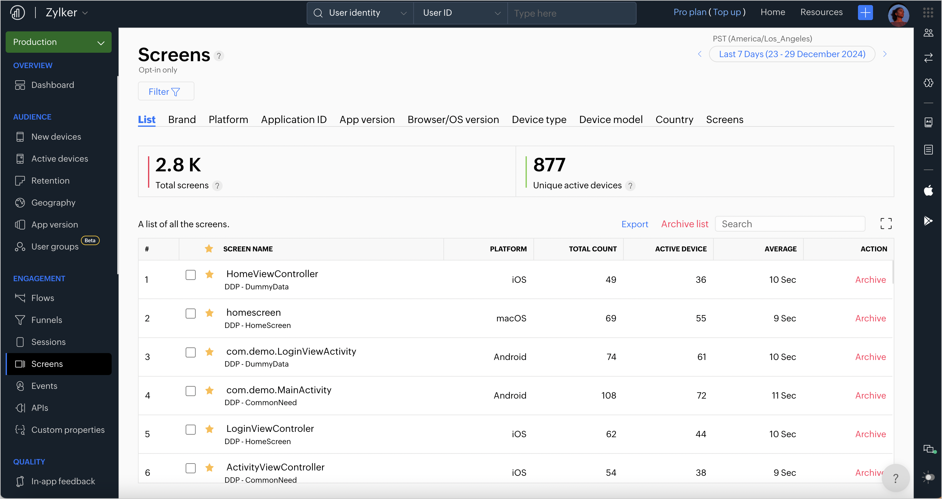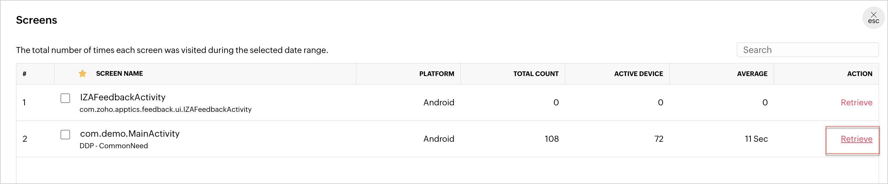 Appticsでは、初期設定時にシンプルなSDK側の設定を行うだけでスクリーンを自動的にトラッキングできます。または、Appticsの分析SDKの初期化後に手動でトラッキングすることも可能です。スクリーンのトラッキングが開始されると、アプリでトラッキングされたすべてのスクリーンの一覧をAppticsコンソールで確認できます。