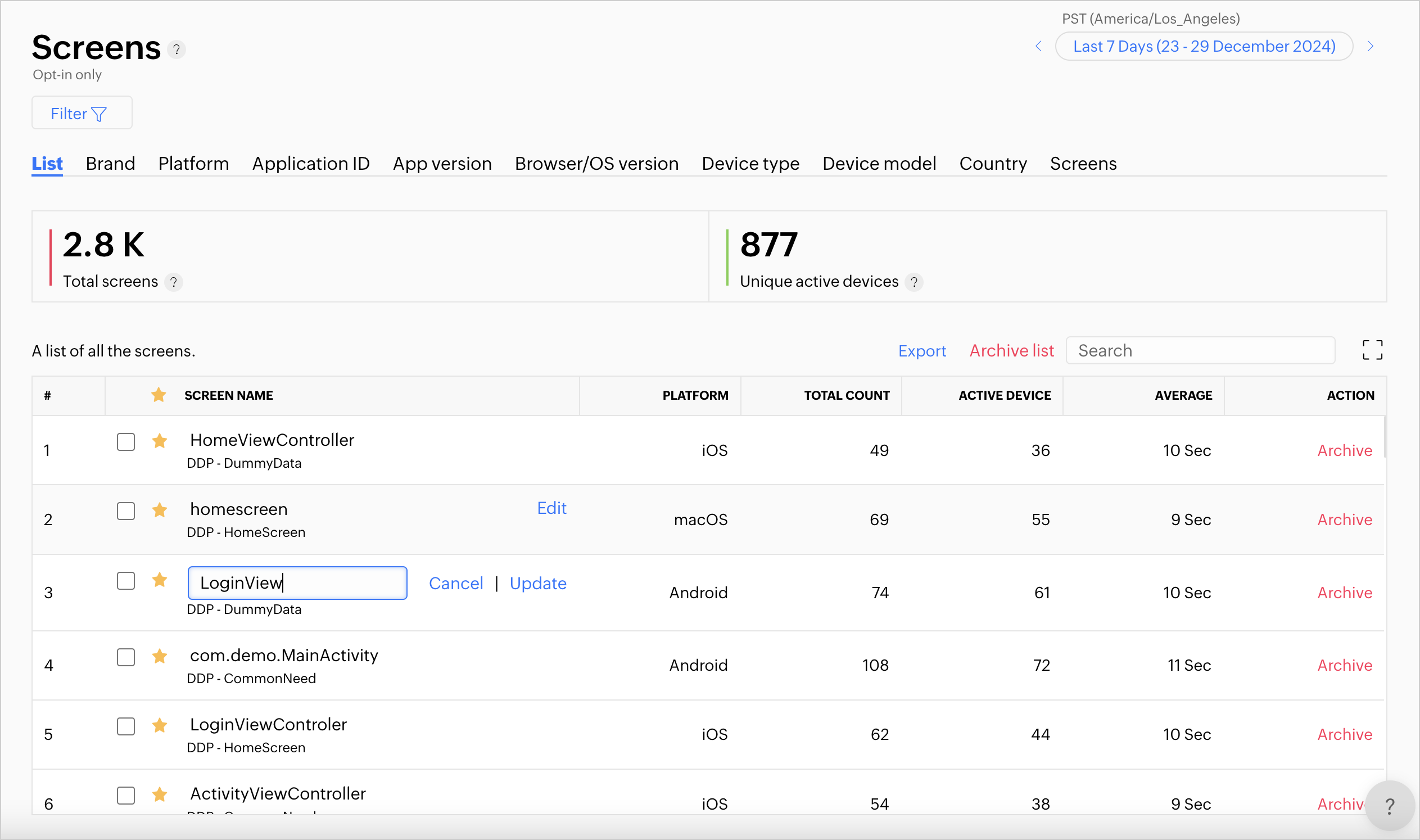 1. 統計情報の下には、アプリでトラッキングされたすべての画面リストが表示され、プラットフォーム、画面訪問の合計数、有効デバイス数、画面上の平均経過時間などの詳細が含まれます。