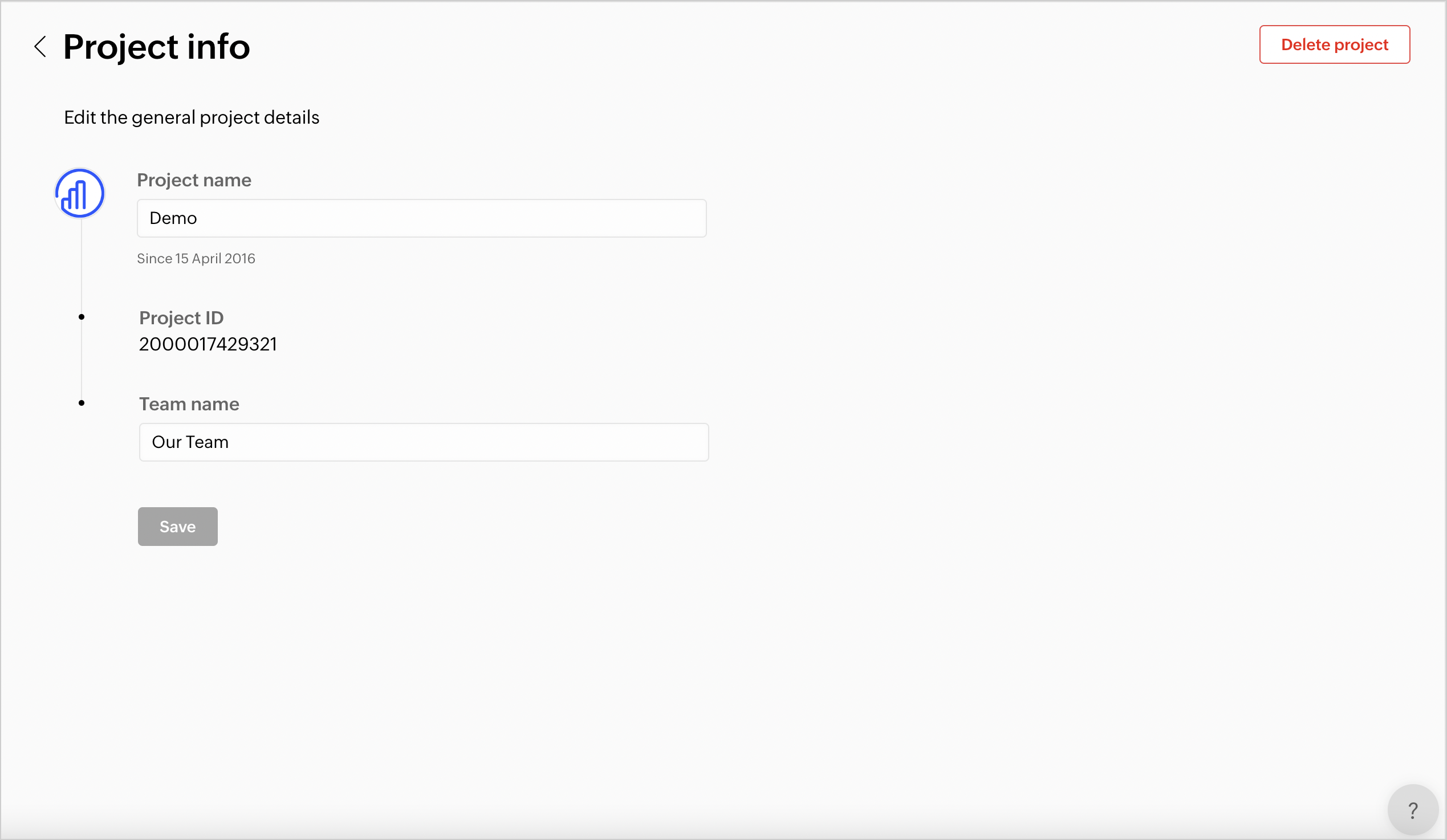 プロジェクト名、ロゴ、チーム名などの基本情報の編集や、プロジェクトの削除が行えます。
