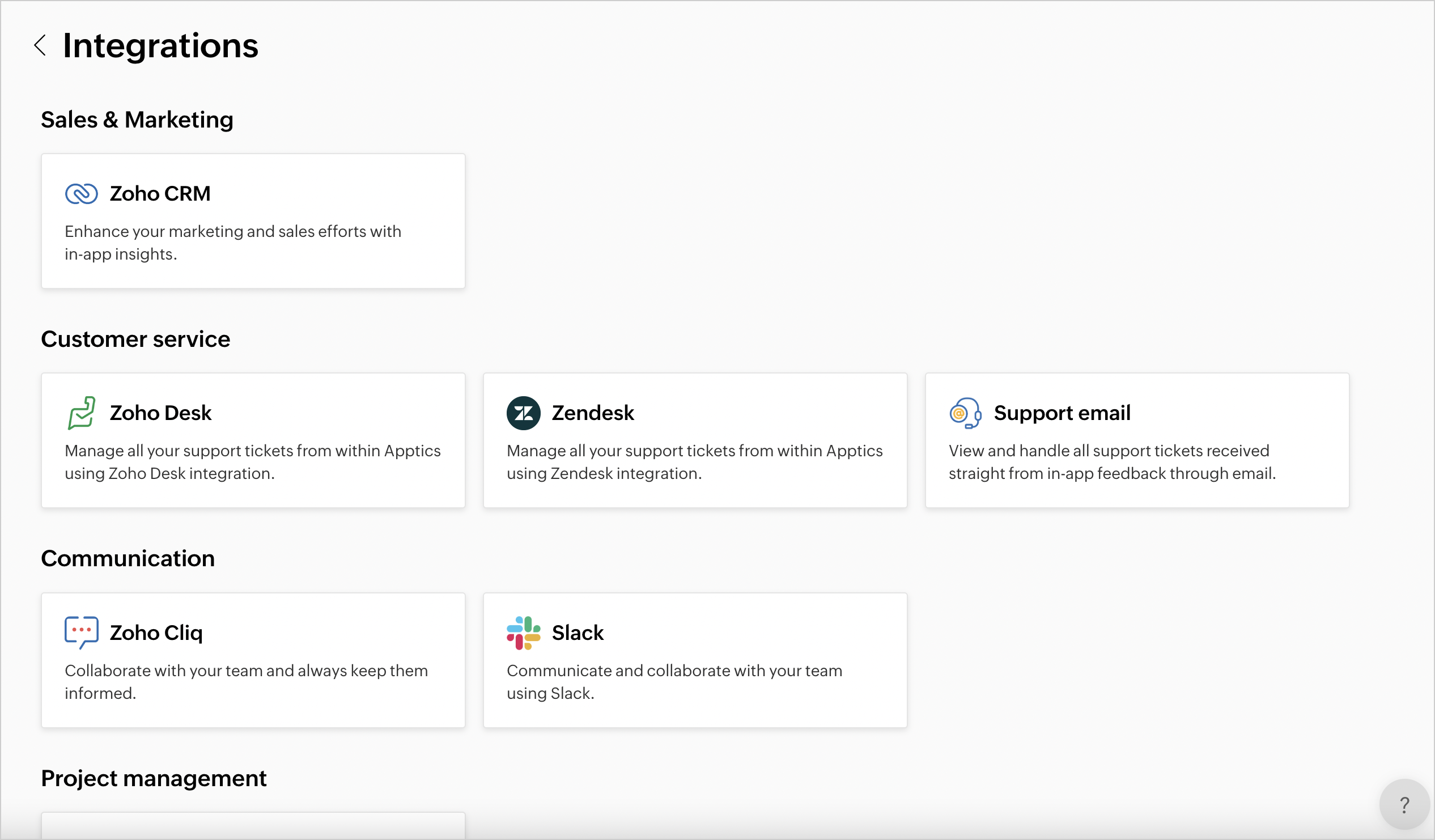 Appticsは、Zohoや他のサードパーティサービスとの連携機能を提供しており、アプリやその他の管理をより効率的に進められます。連携の有効化・無効化は、プロジェクトマネージャー、開発者見込み客、開発者のみが行うことができます。