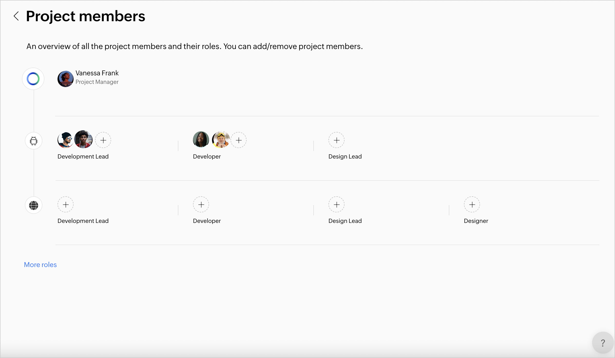 メモ: プロジェクトにメンバーを追加できるのは、すでにポータルのメンバーである場合のみです。役割へのメンバー追加時、+アイコンをクリックすると既存のポータルメンバーのみが表示されます。追加しようとしているユーザーがポータルメンバーでない場合は、ポータル管理者またはスーパ管理者に連絡し、そのユーザーをポータルに招待してください。