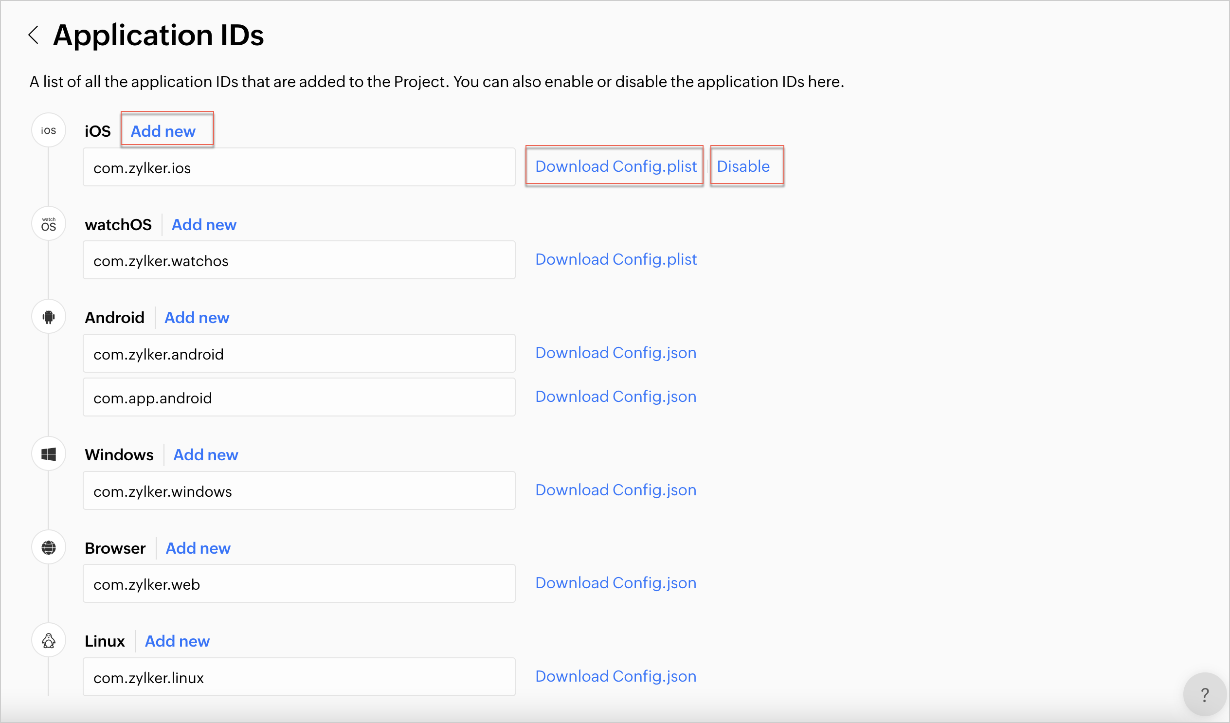プラットフォームごとに追加されたすべてのアプリケーションIDの一覧を確認できます。新しいアプリケーションIDの追加、各アプリケーションIDの構成ファイルのダウンロード、既存アプリケーションIDの有効化/無効化も可能です。