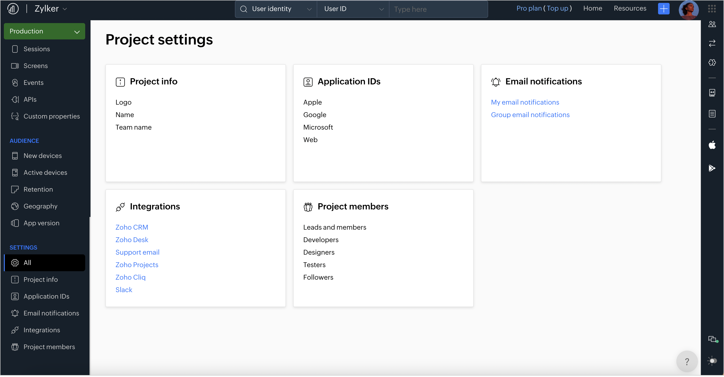 プロジェクト設定ページでは、プロジェクト単位の設定を変更し、ご希望の方法でプロジェクトを管理できます。一般的なプロジェクト情報の編集、プロジェクトメンバーやアプリケーションIDの管理、プロジェクト単位のメール通知設定、他サービスとの連携設定などが行えます。