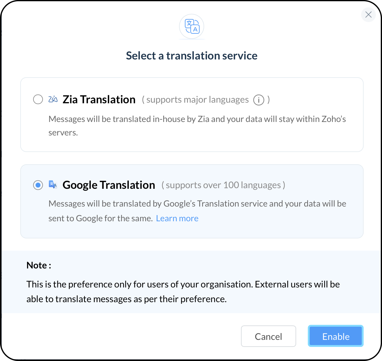 2. Zia- ZohoのAIアシスタントかGoogle Translatorを利用してメッセージを翻訳することができます。