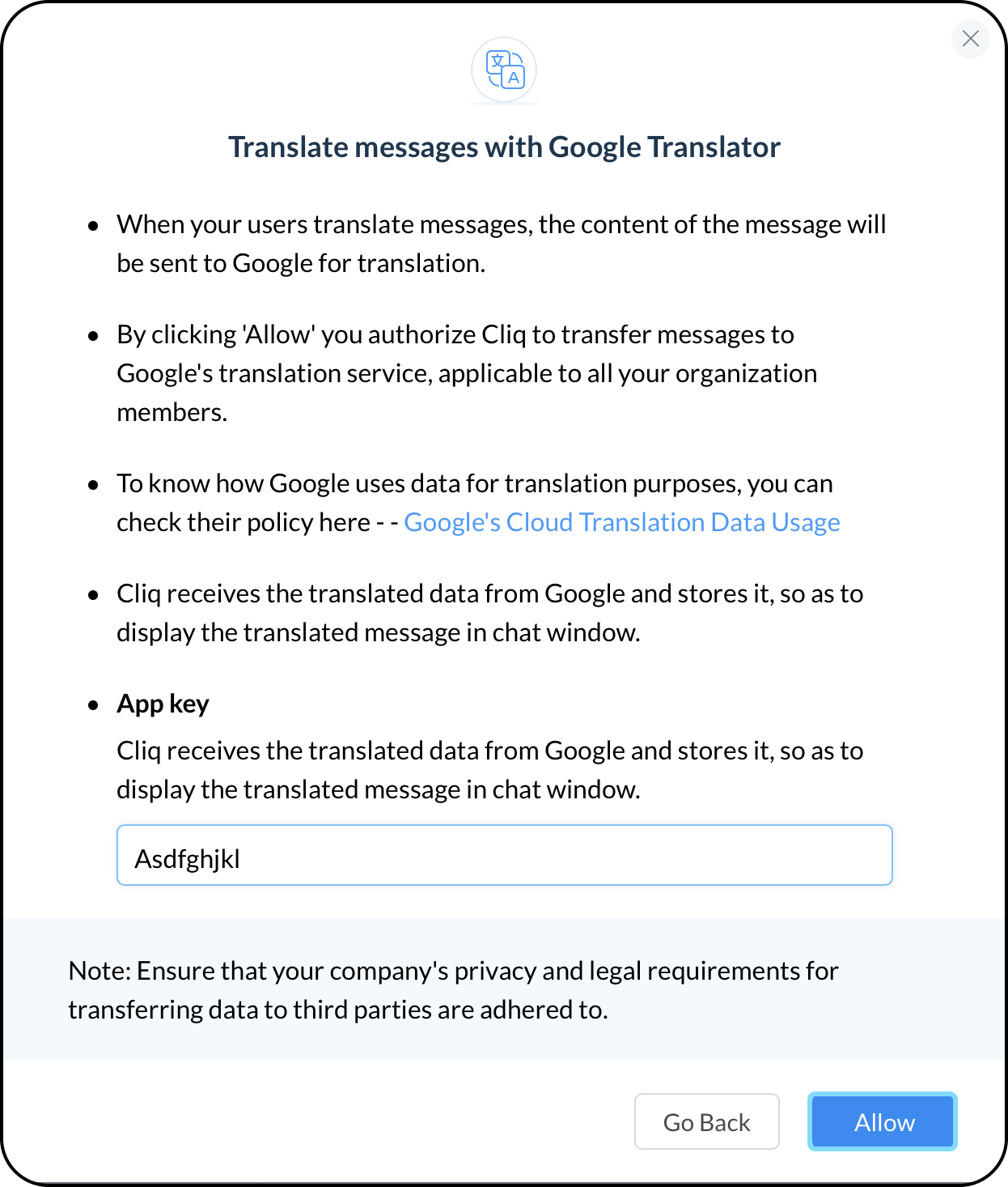 3. Google Translatorを購入して、APIキーを取得する必要があります。APIキーを入力し、許可を選択します。