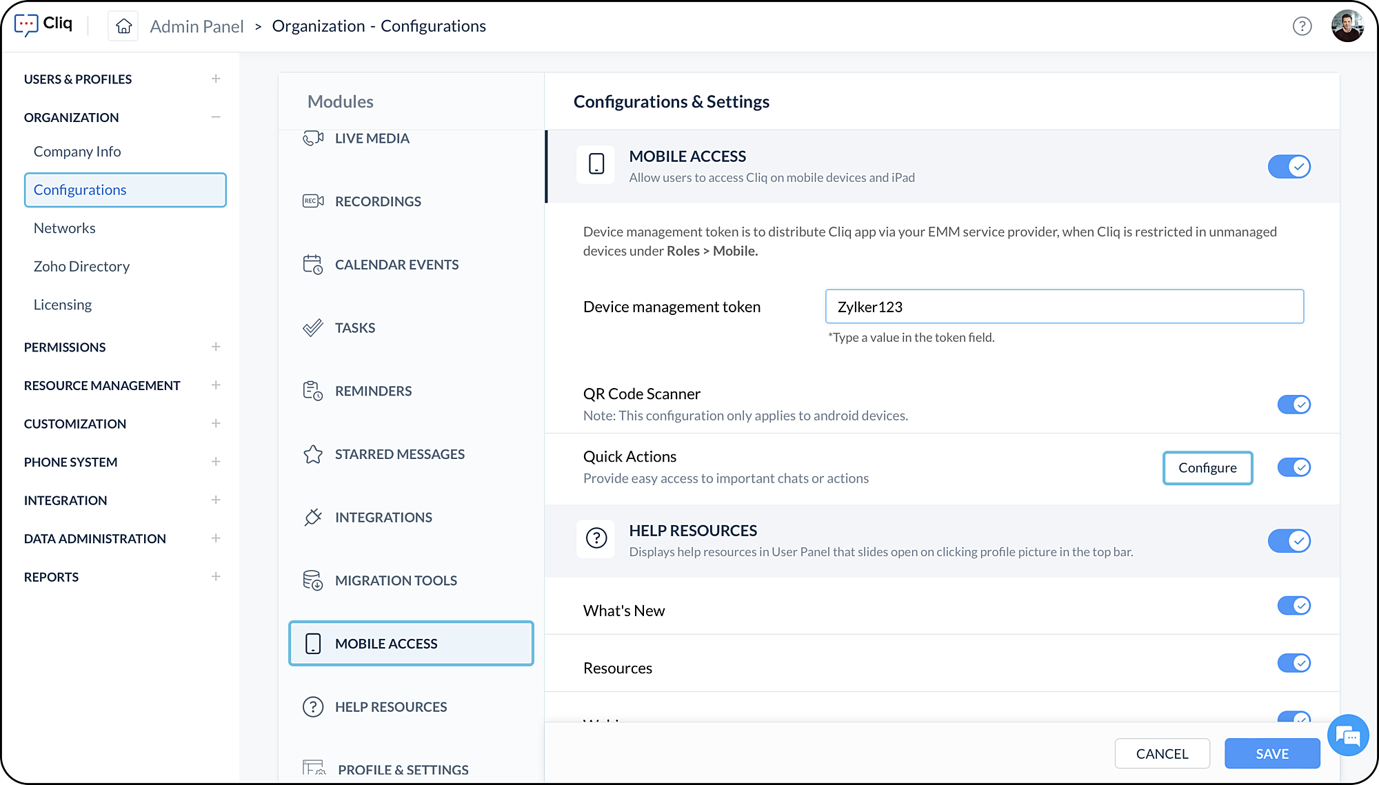 2. モバイルアクセスを選択し、クイックアクションのトグルボタンを有効にし、設定を選択して、クイックアクションに追加するアクションを選択します。