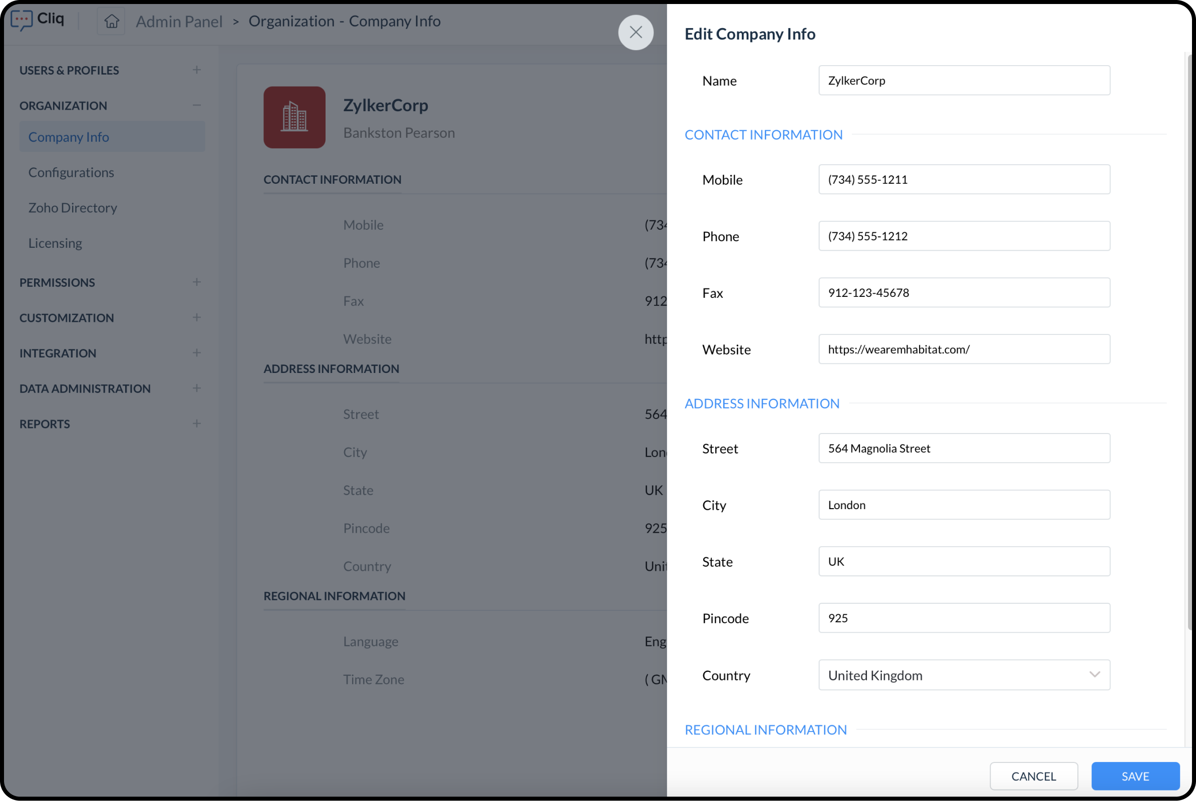 管理パネルのビューの下の組織モジュール内で、会社情報をクリックしてください。