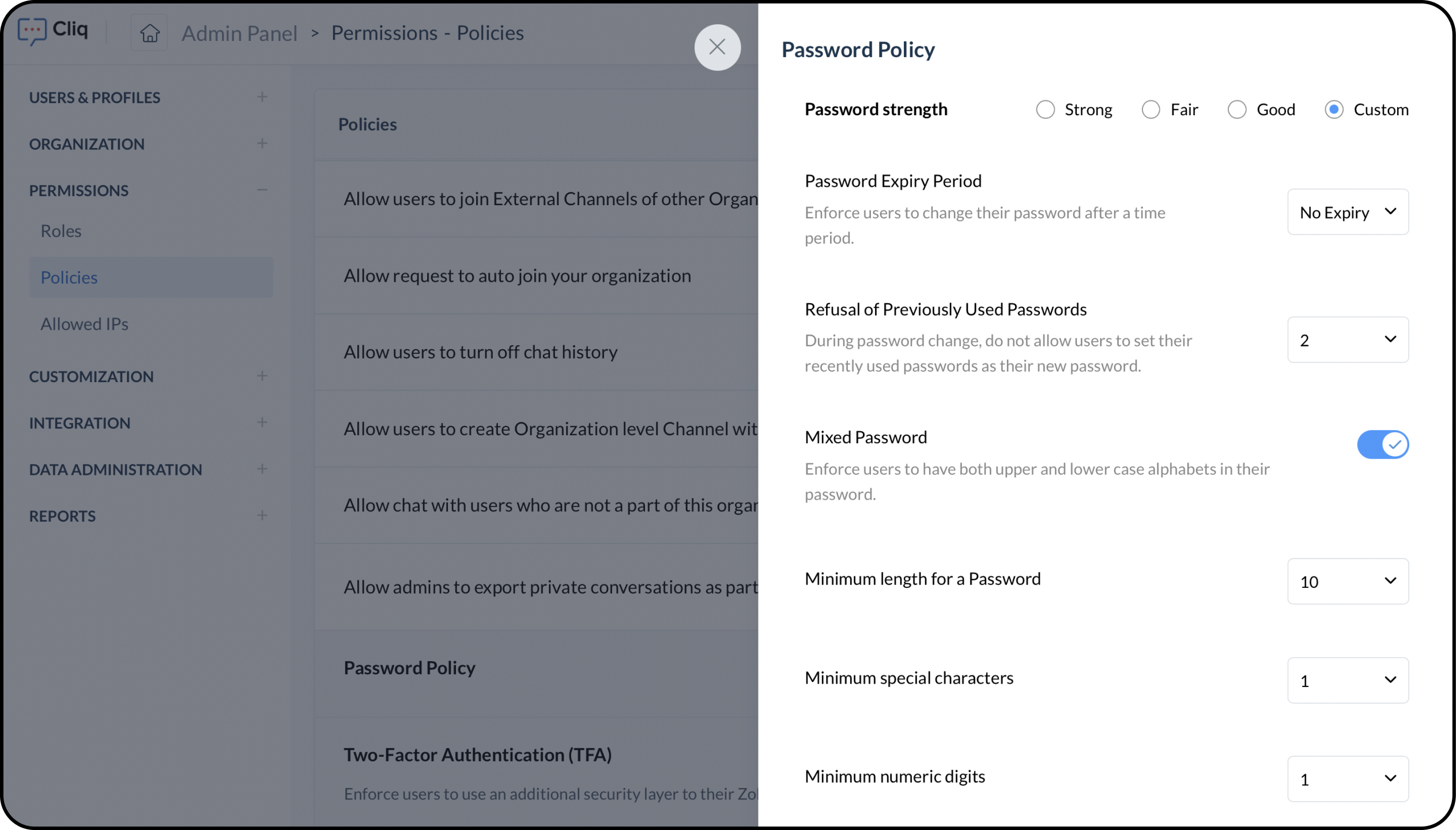 パスワードポリシーに加えて、Cliqには、基本的なユーザー名とパスワードの追加レベルのセキュリティを提供するための2要素認証もあります。組織の2要素認証を有効にする方法については、以下のリンクを参照してください。 リンク