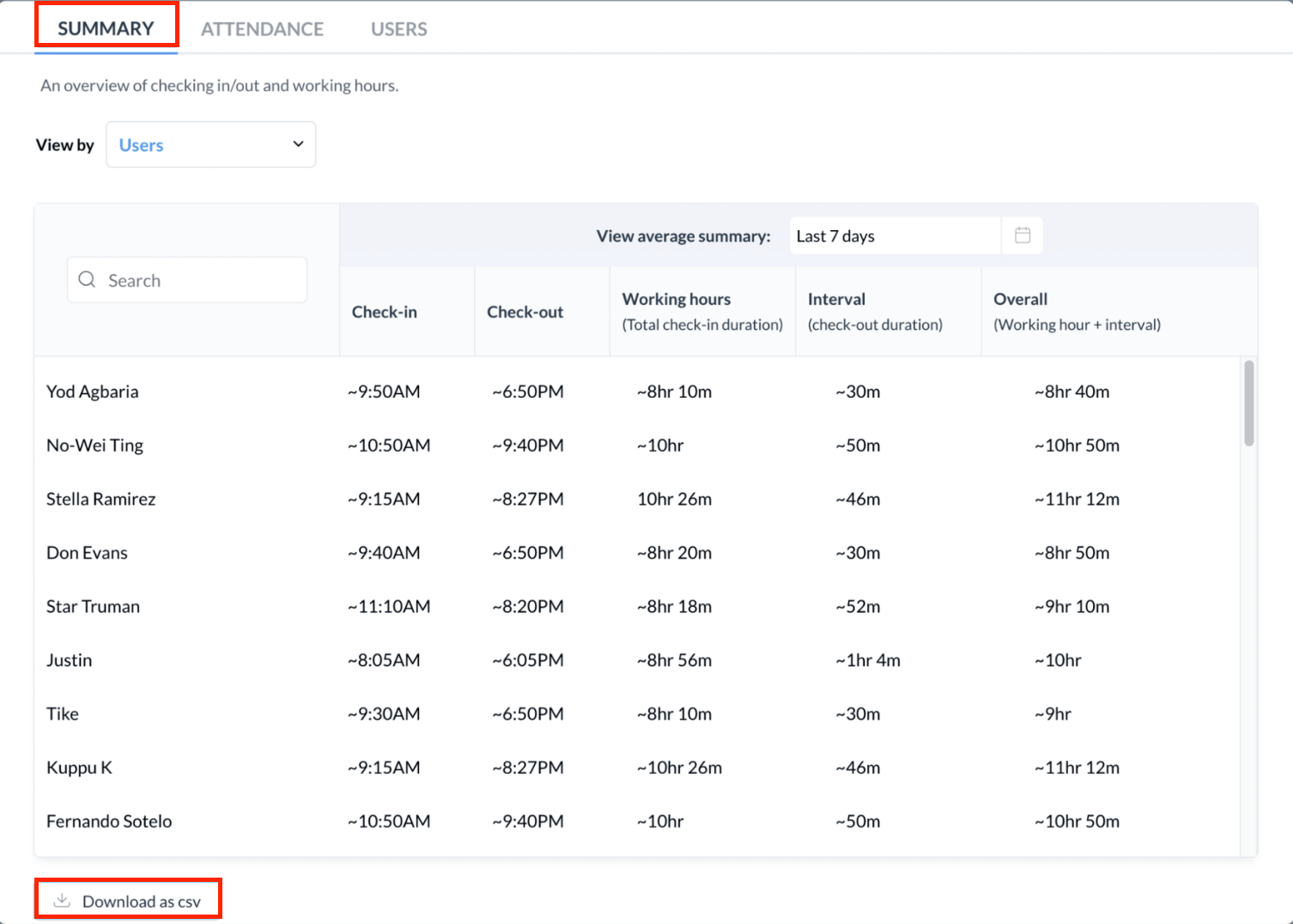 ユーザーのチェックイン・チェックアウト時刻、稼働時間(チェックインしていた合計時間)、離席時間(チェックアウトしていた時間)、および合計時間(稼働時間+離席時間)もレポートに含まれます。