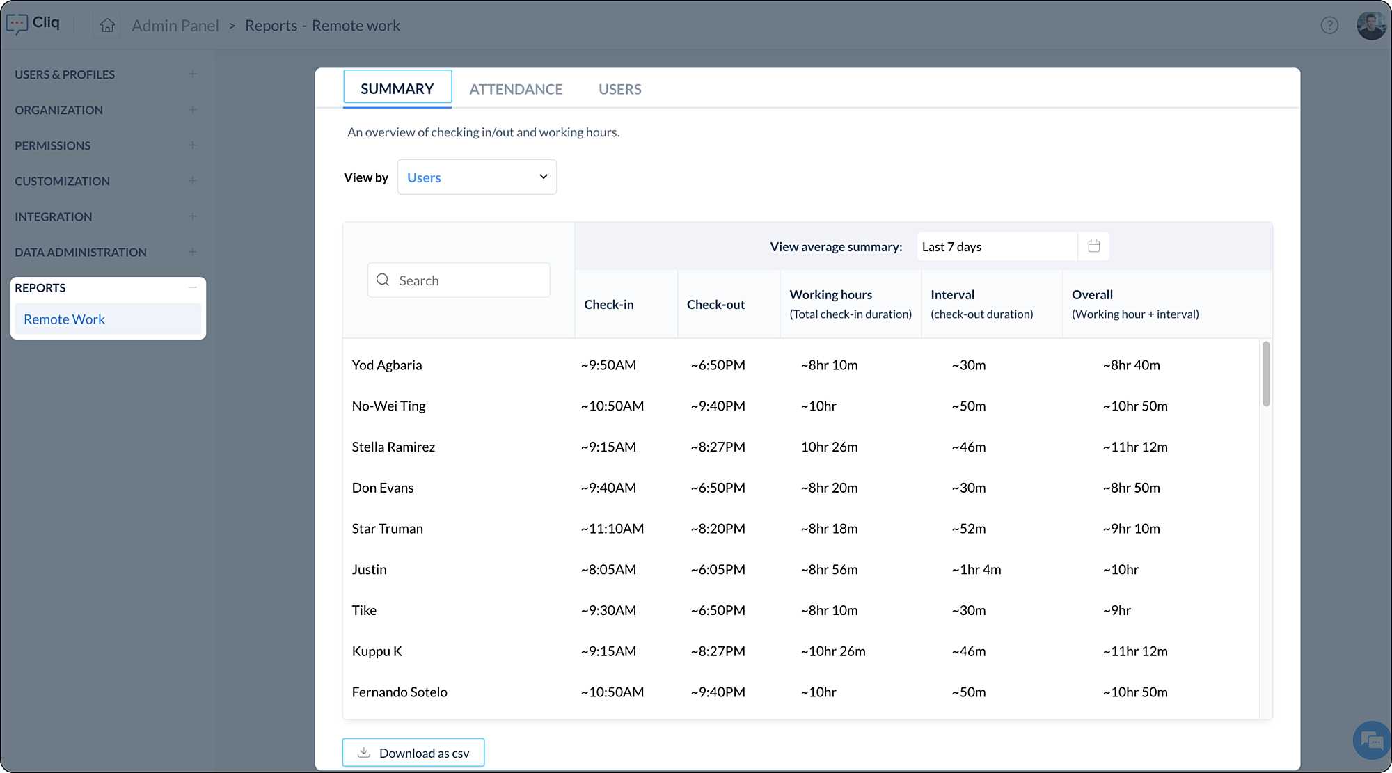 サマリーレポートは、チェックイン/アウトの時間、勤務時間、内部時間、および全体の時間の概要を提供します。