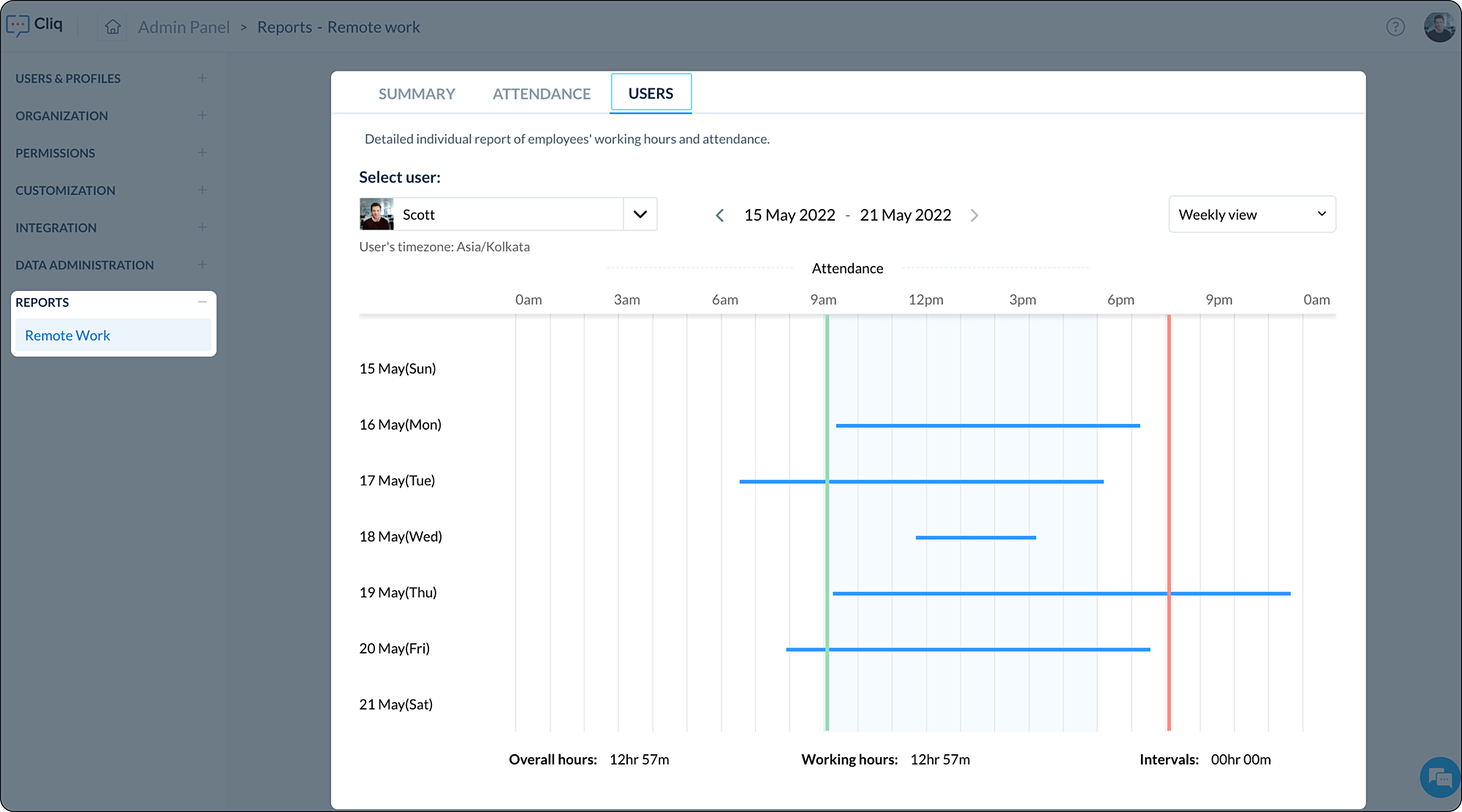 ユーザーレポートは、ユーザーの週間および月間の詳細な出席状況を概観するものです。