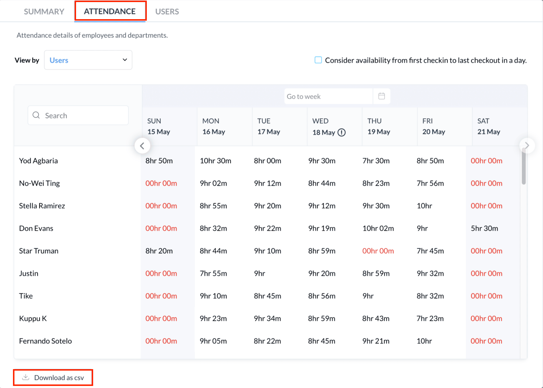 [Download as csv]オプションをクリックして、出勤レポートを CSV 形式でダウンロードすることもできます。