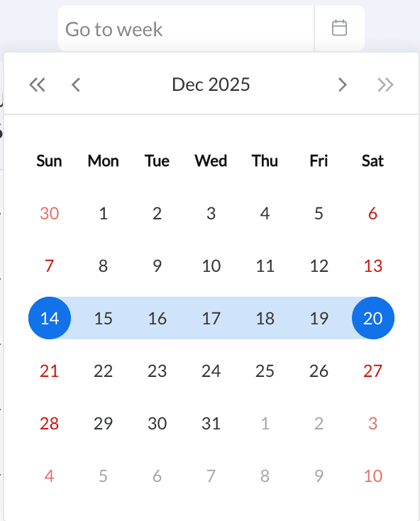 出勤データは、現在の週を表示するか、カレンダーを使用して特定の週を選択して表示できます。