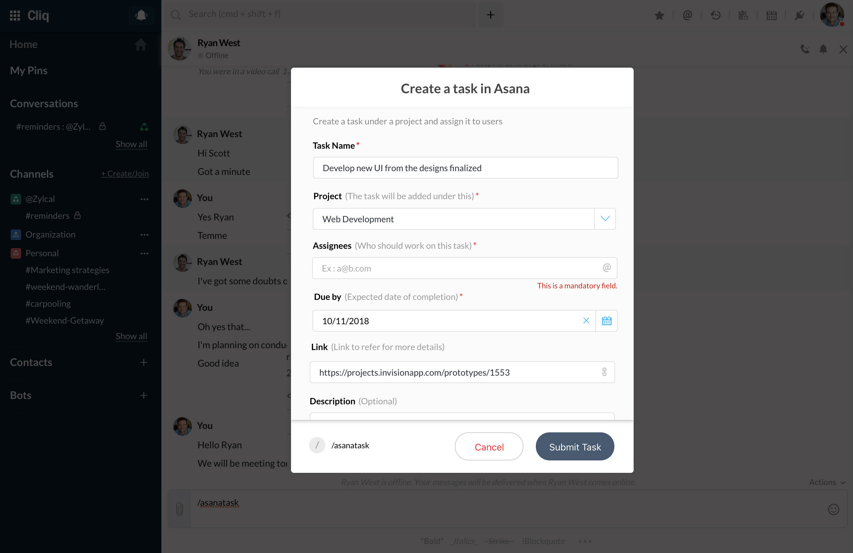フォームには、1行入力から複数選択までさまざまなタイプのフィールドがあります。これらのフォームはCliq内で構築されており、Cliqデータと統合されているため、ユーザー、チャット、チームの選択が容易に行えます。