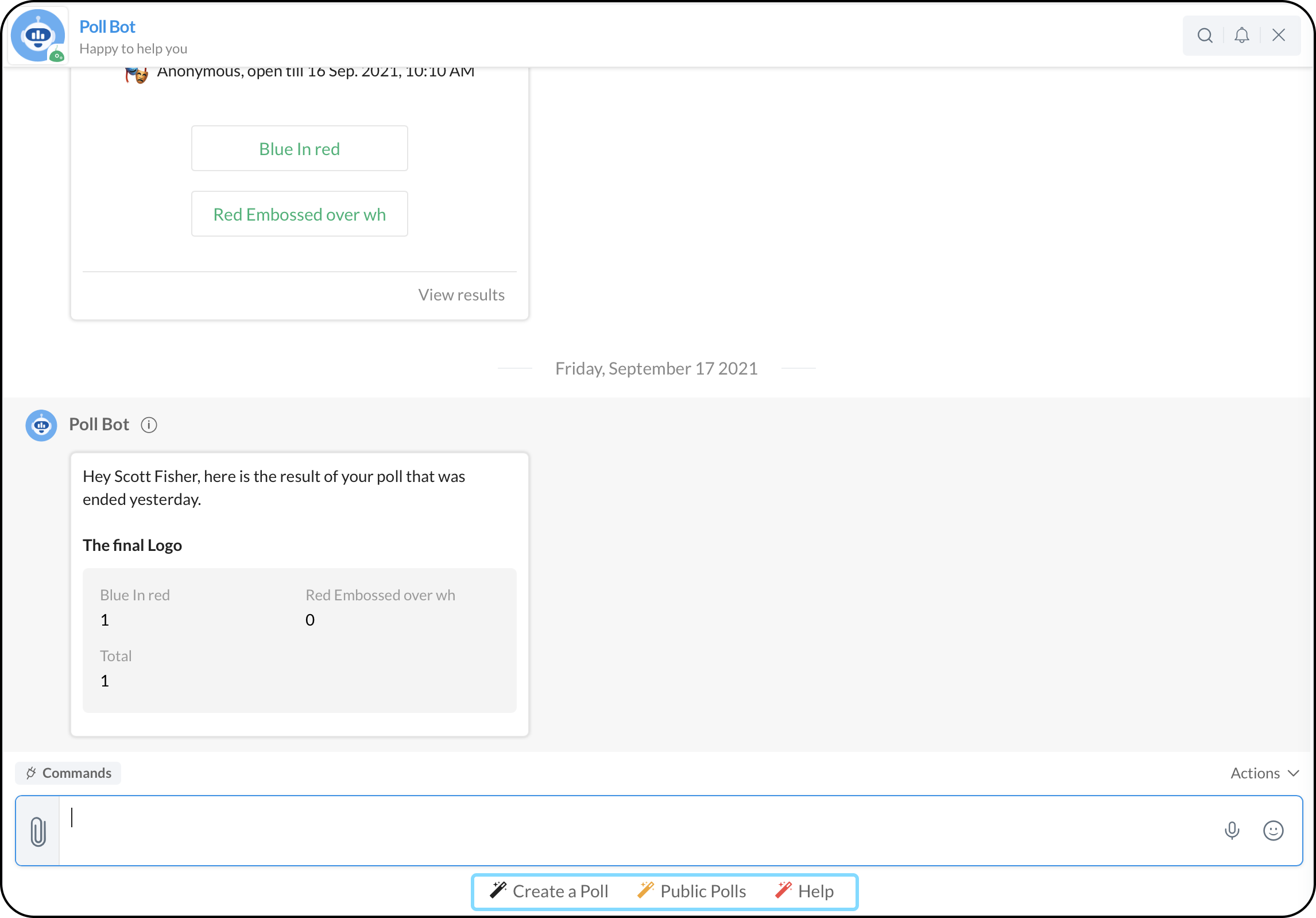 例えば、ポールボットを構成することで、ユーザーとの対話のためのポールカードを作成するなどのインストラクションを実行するためにテキストエリアに入力したり、チャットウィンドウの提供されたオプションを選択することができます。
