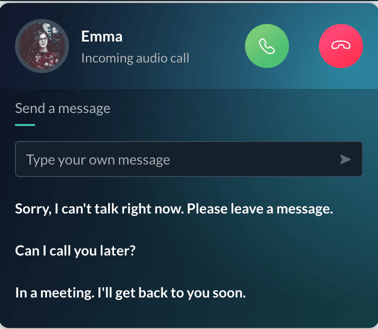 - 音声通話: 音声通話を受信した場合、利用できるオプションは次の3つです: 応答、拒否、メッセージを送信して拒否。