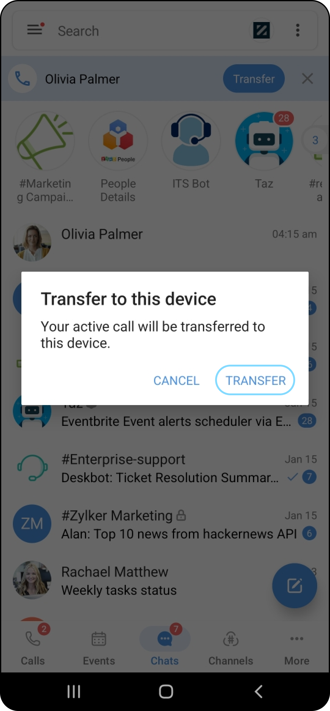 2. 確認ポップアップが表示され、このデバイスに現在の通話を転送するように求められます。転送を選択すると、通話がモバイルデバイスに転送され、Webデバイスの通話が終了します。